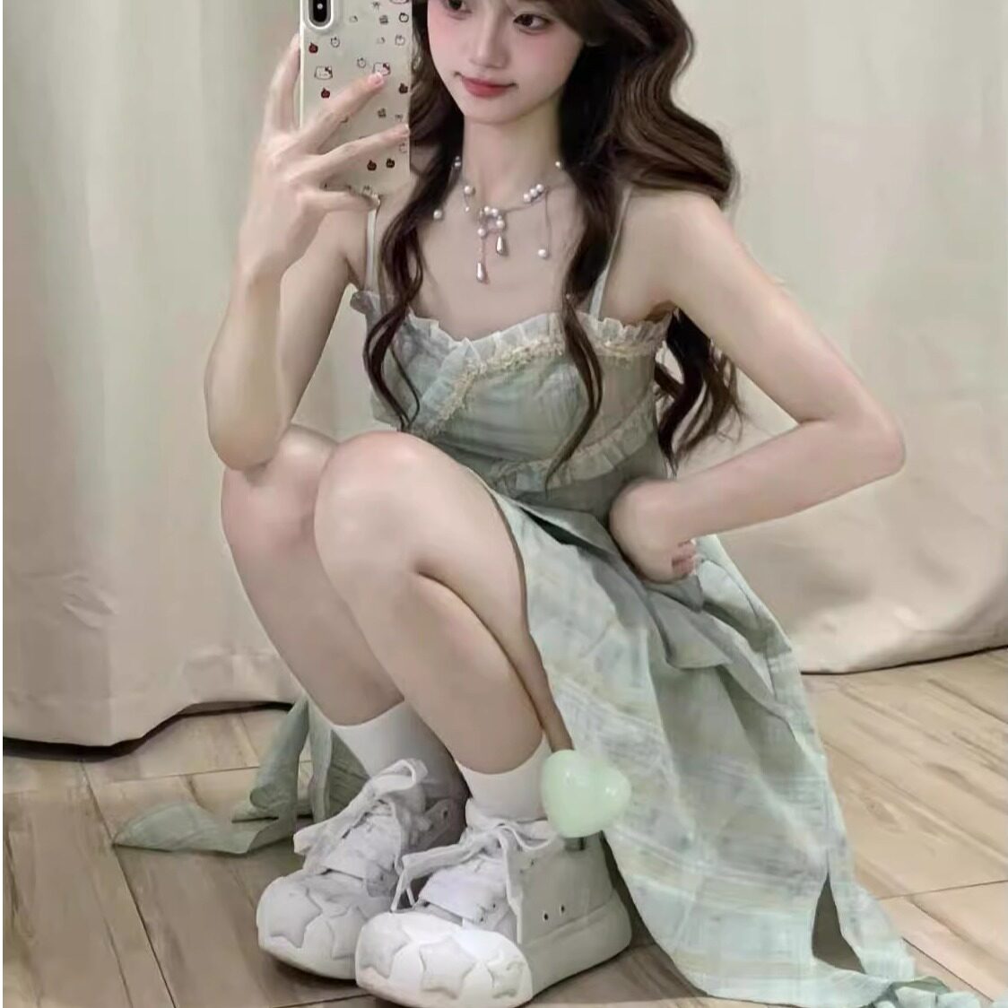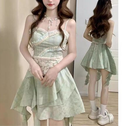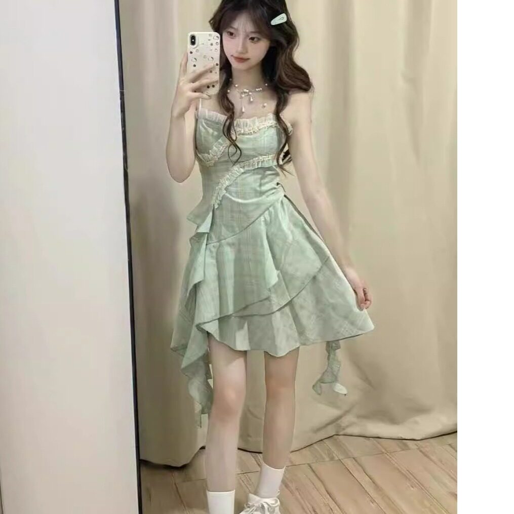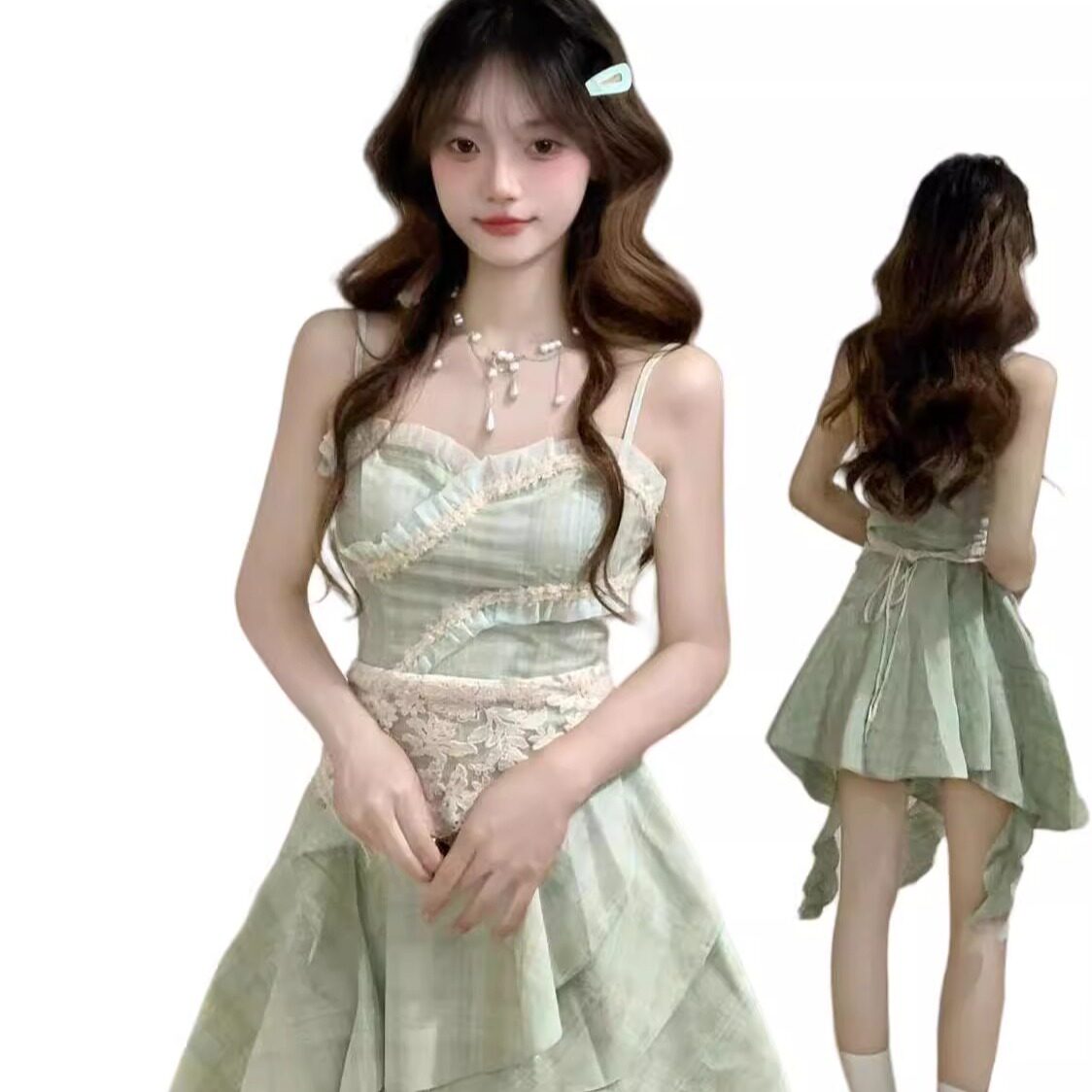 2025春季新款少女风甜美绿色无袖吊带裙学生收腰显瘦不规则中长裙