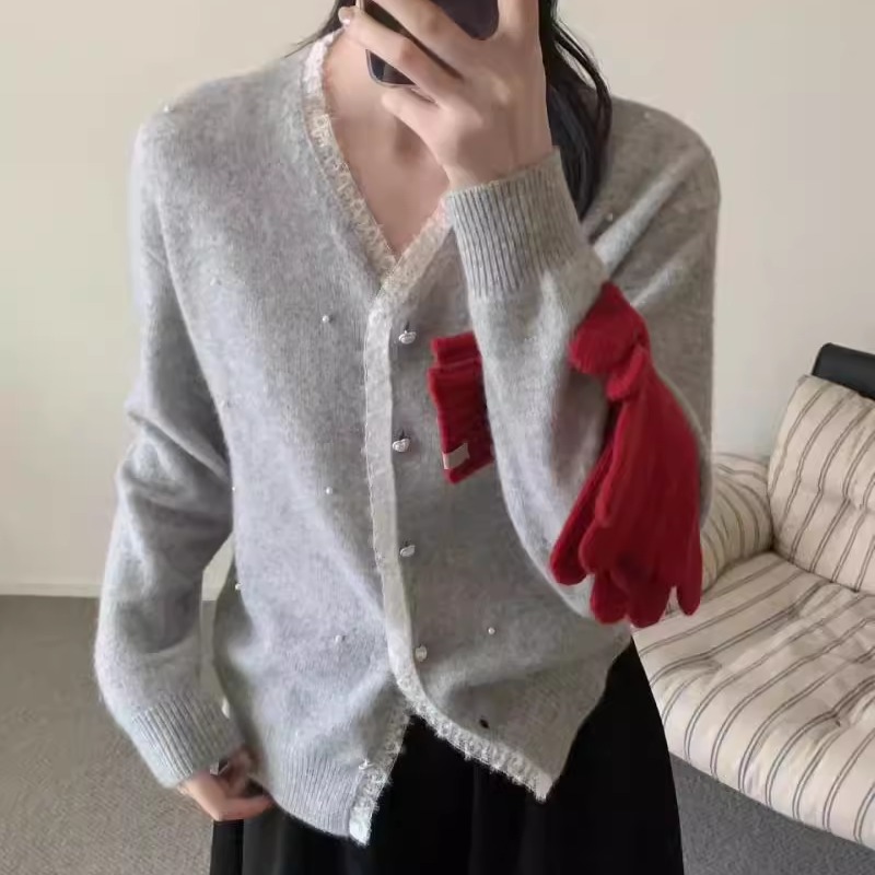 BADX正品韩系简约甜美蕾丝边长袖贝熊绒针织开衫秋季宽松毛衣外套