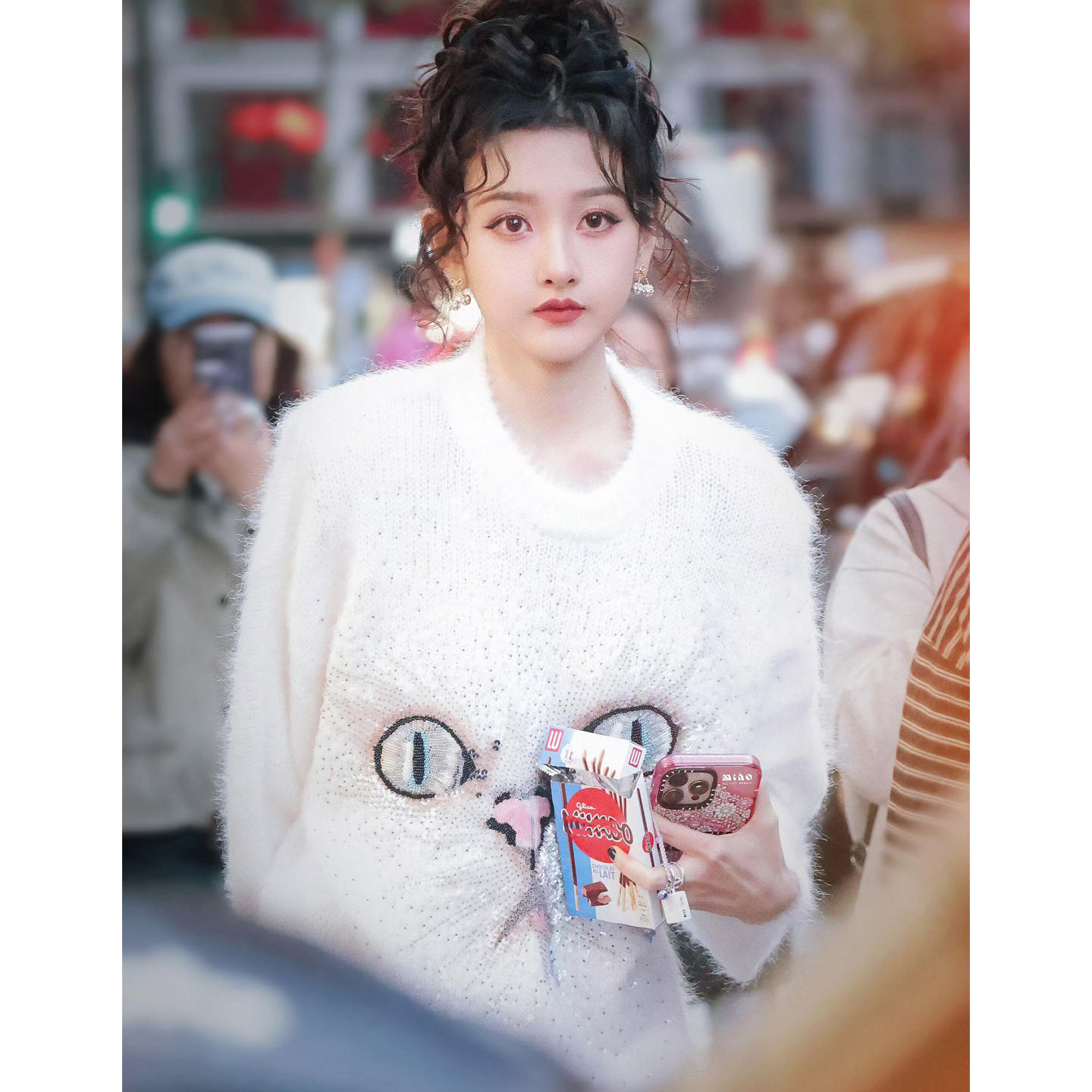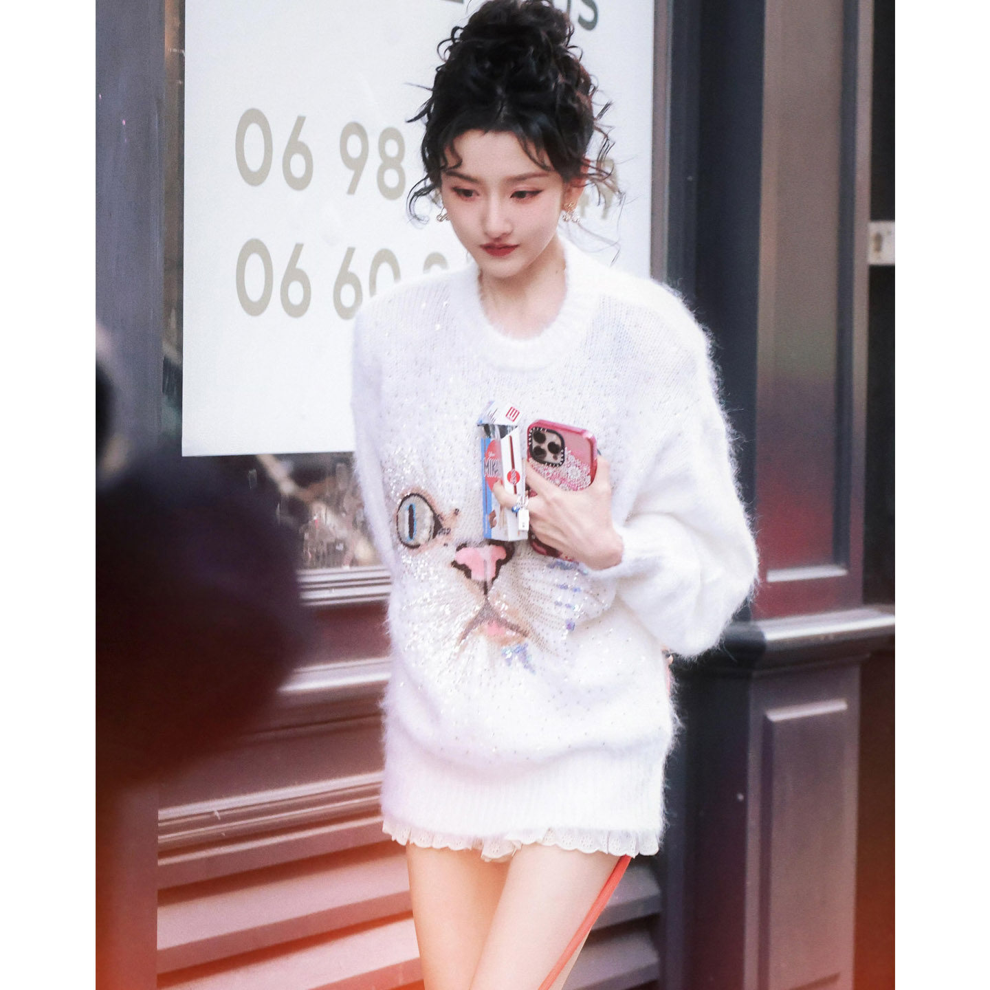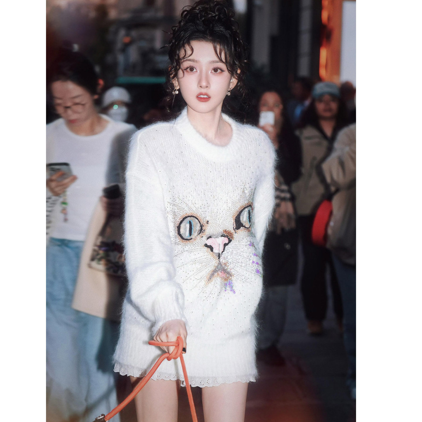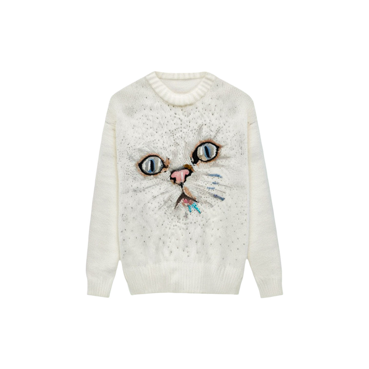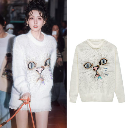 宋祖儿同款软糯刺绣猫咪套头毛衣女秋冬宽松慵懒风外穿针织衫上衣