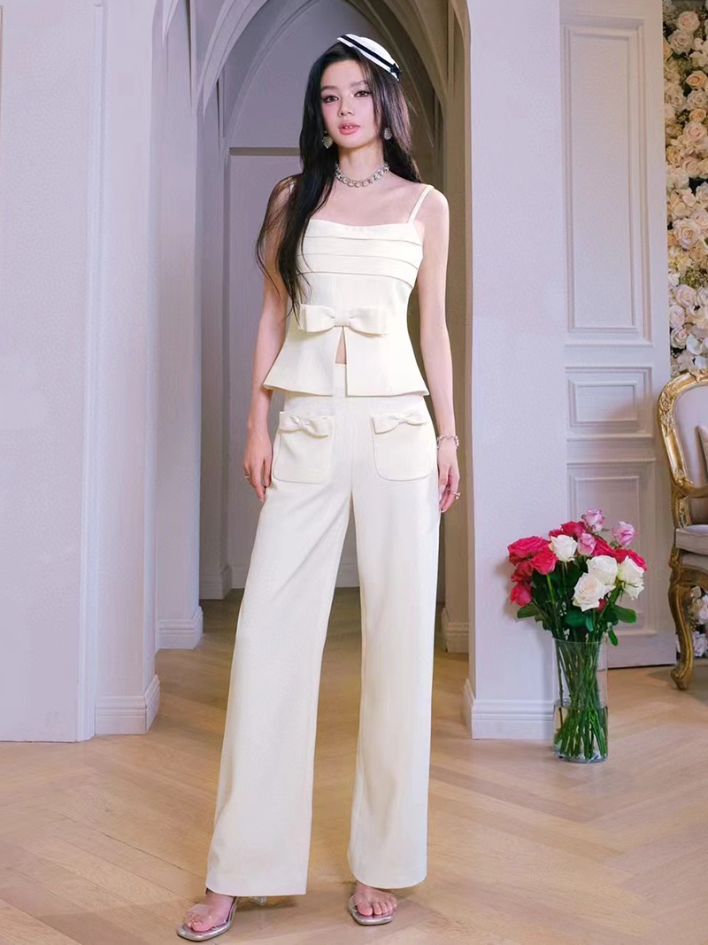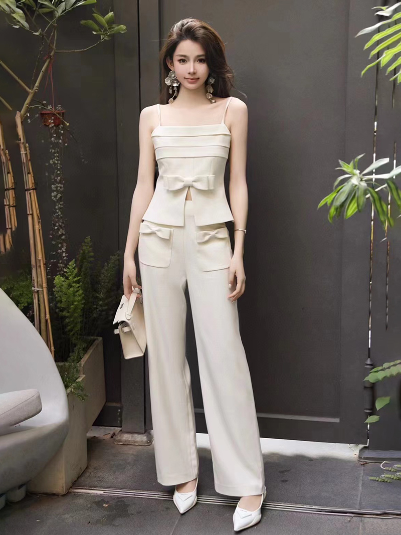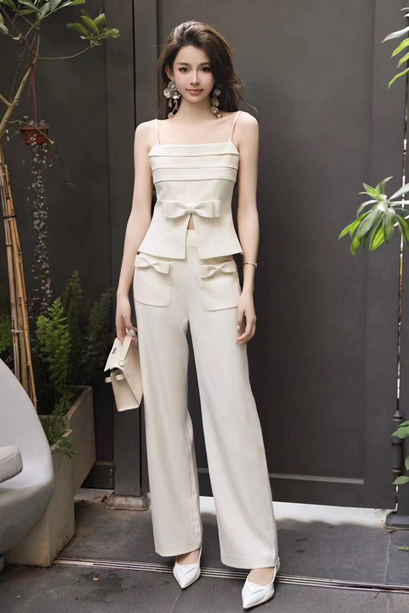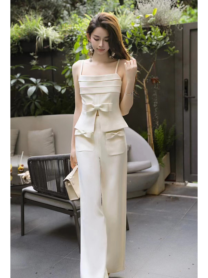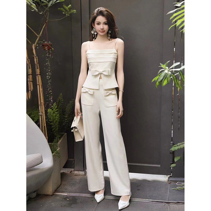 泰国潮牌女夏新款名媛轻奢气质立体蝴蝶结吊带洋气阔腿裤时尚套装