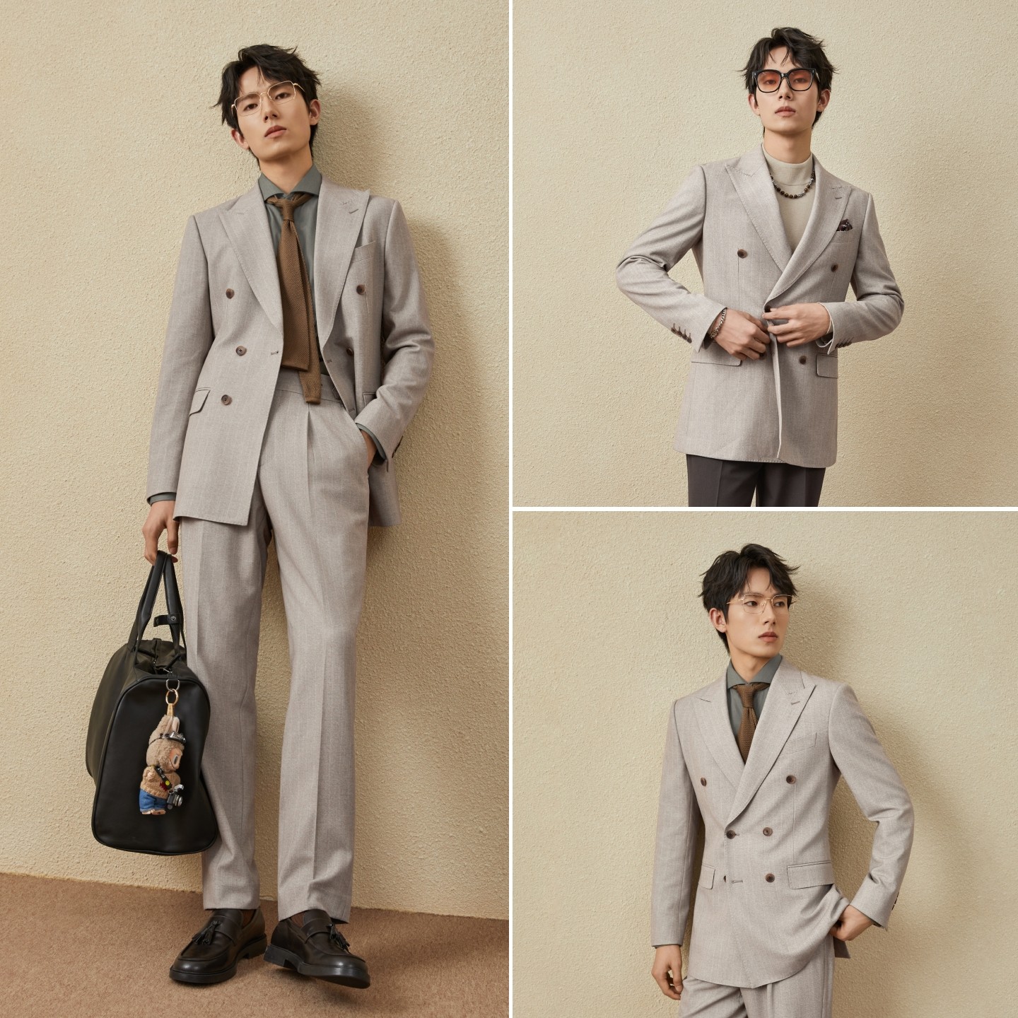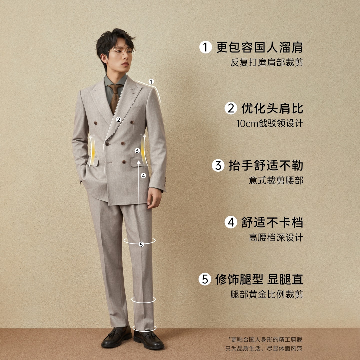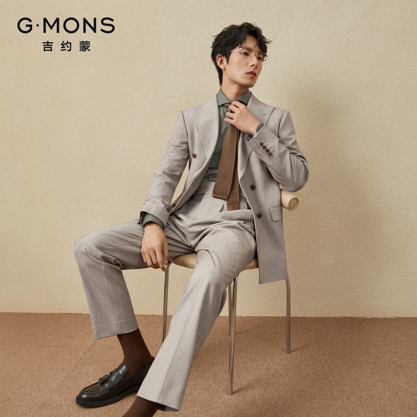 吉约蒙双排扣西装男套装条纹浅灰色高级商务正装西服新郎结婚礼服