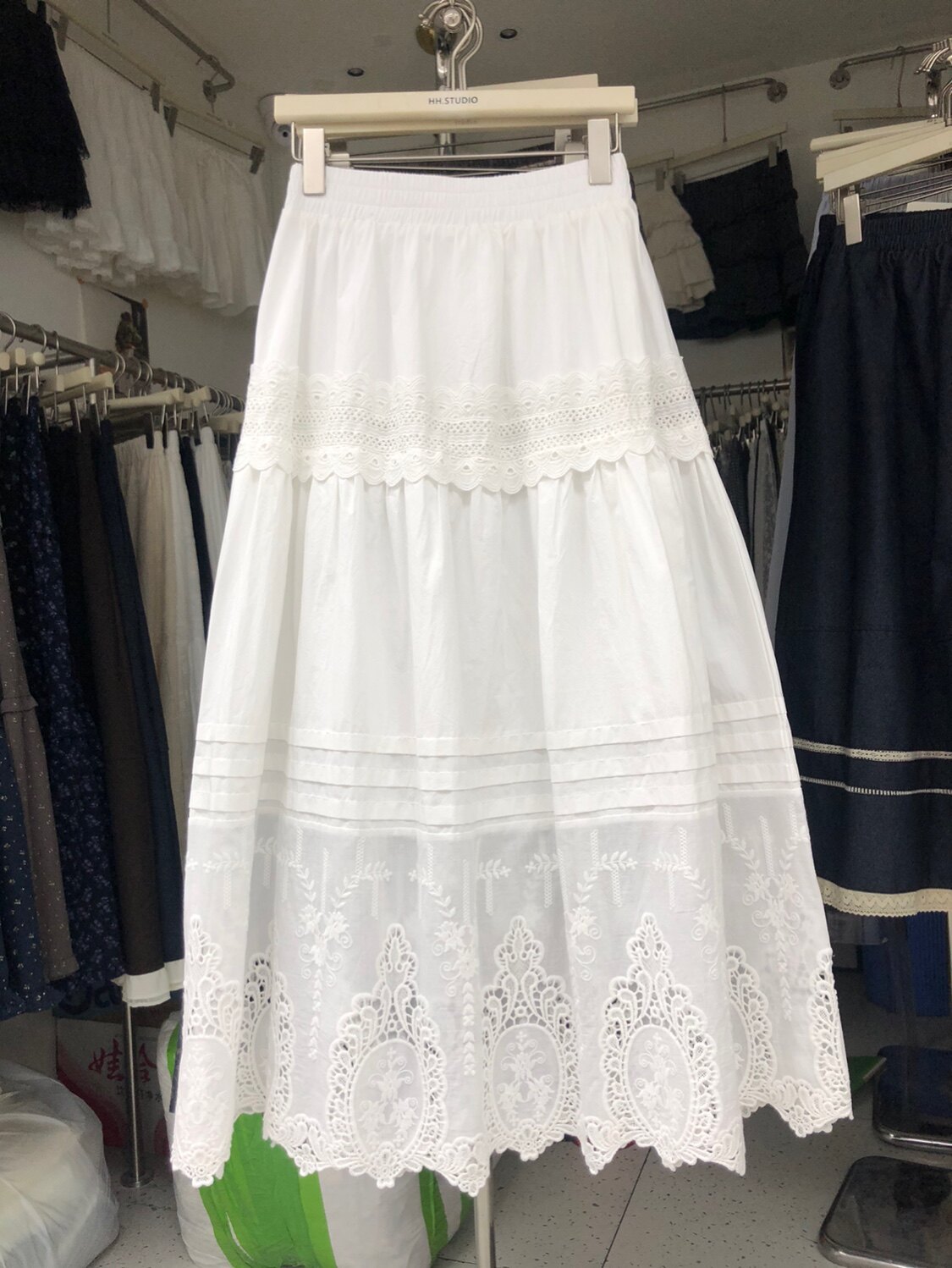 白月光超重工小白裙2025春秋新款白色中长款蕾丝刺绣拼接半身裙女