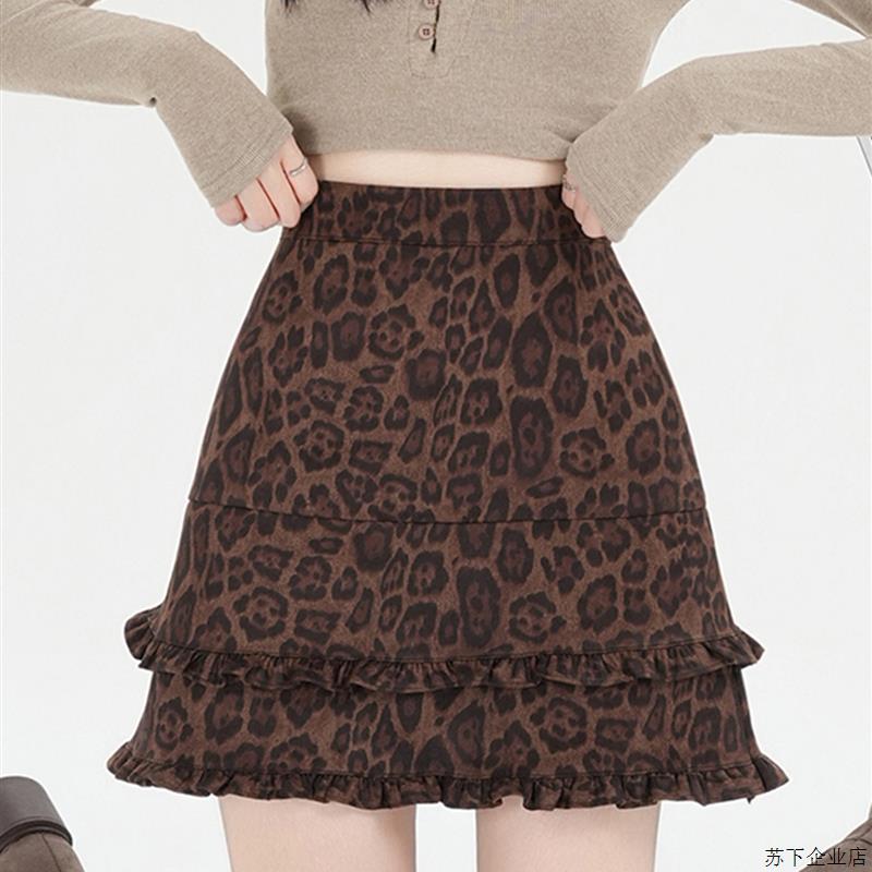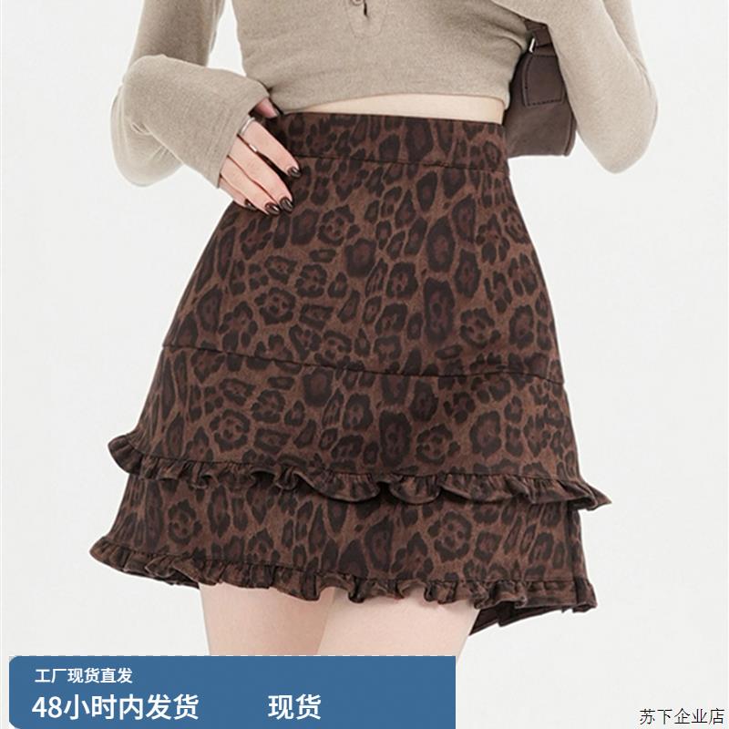 覆古豹纹木耳边半身裙女秋冬新款小个子显瘦高腰百搭a字包臀短裙