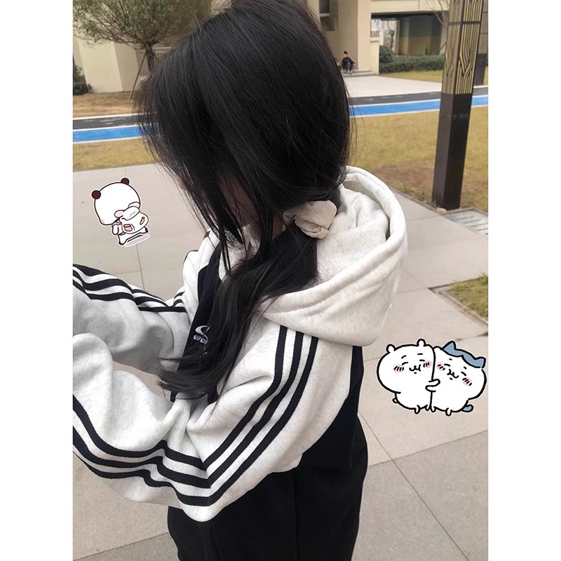 拼接撞色插肩袖连帽卫衣女秋冬oversize加绒加厚外套宽松慵懒上衣