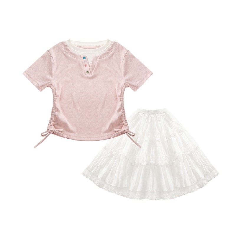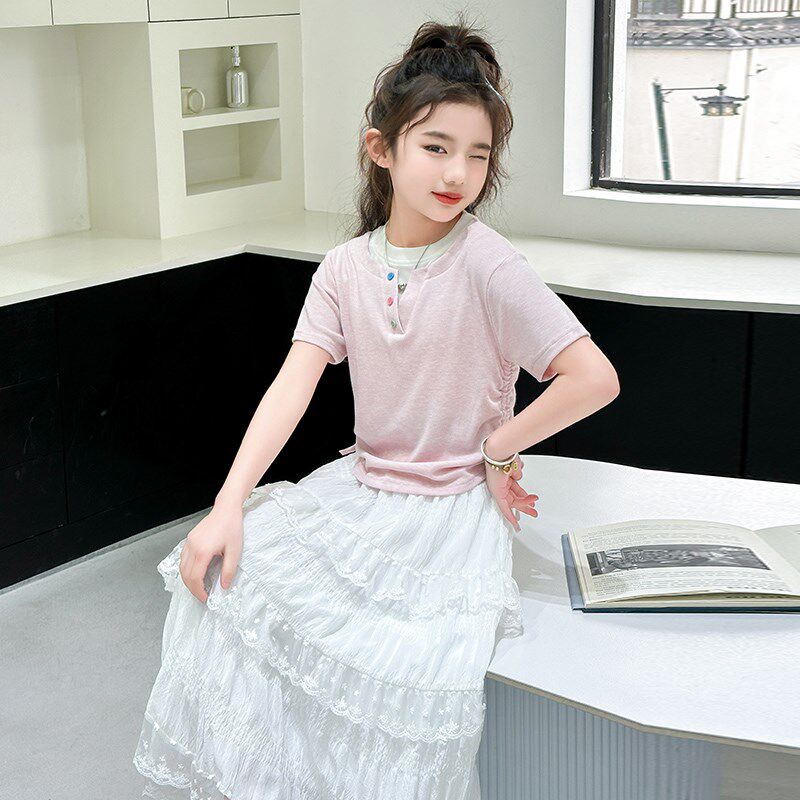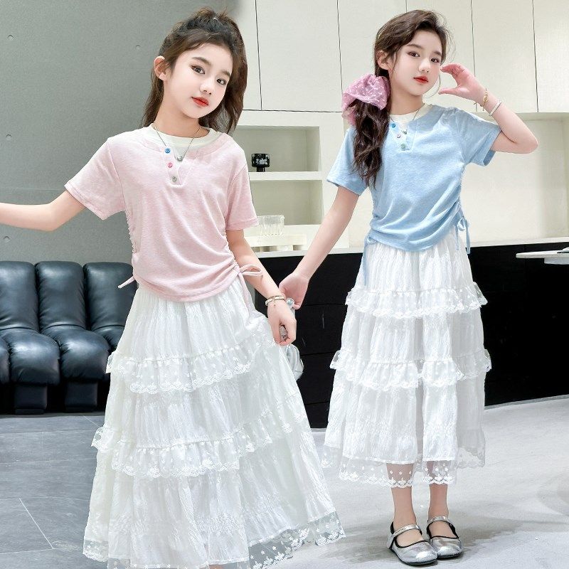 女童夏季套装超好看时尚短袖T恤+白色半身长裙女孩套裙儿童两件套