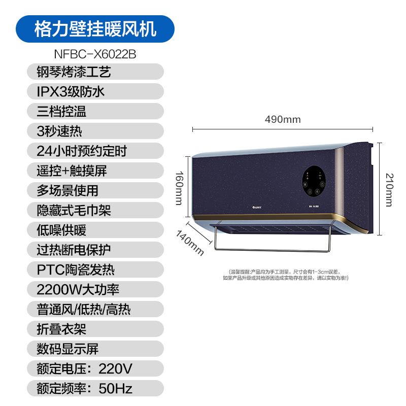 格力暖风机浴室壁挂取暖器浴霸防水居浴冷暖两用电暖器遥控款电热