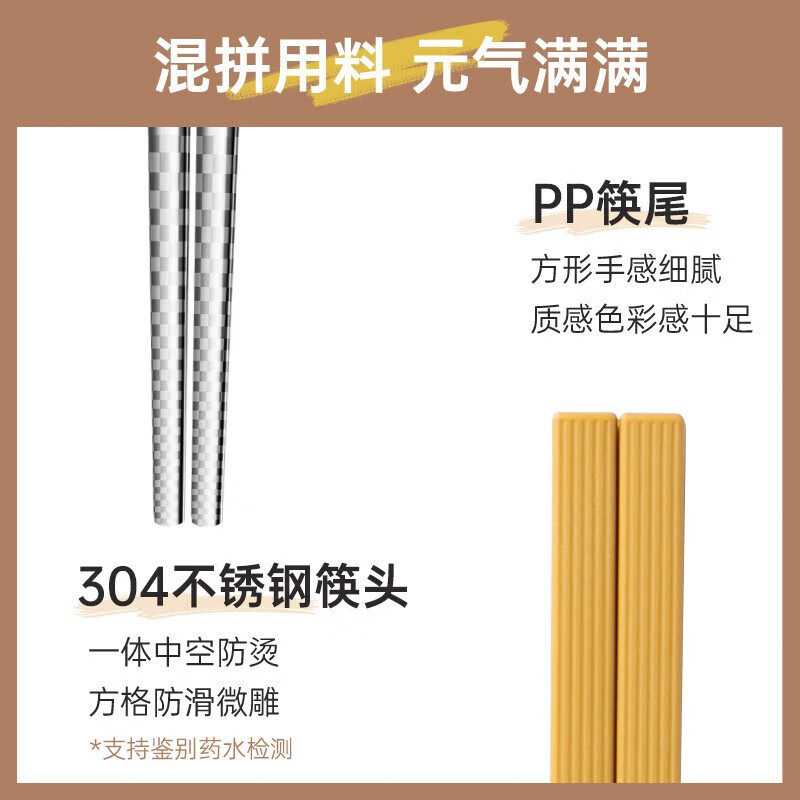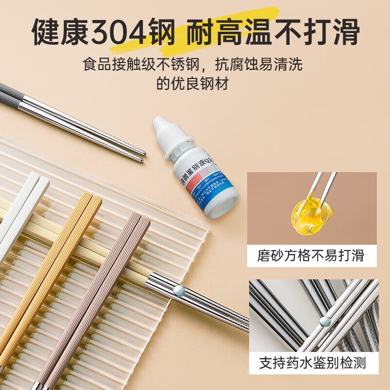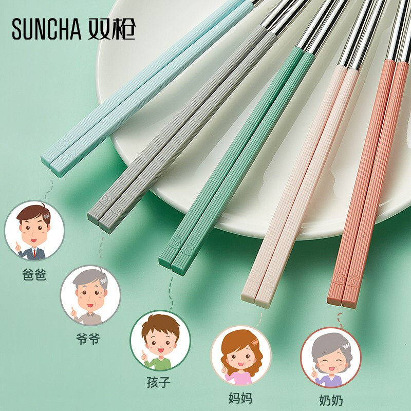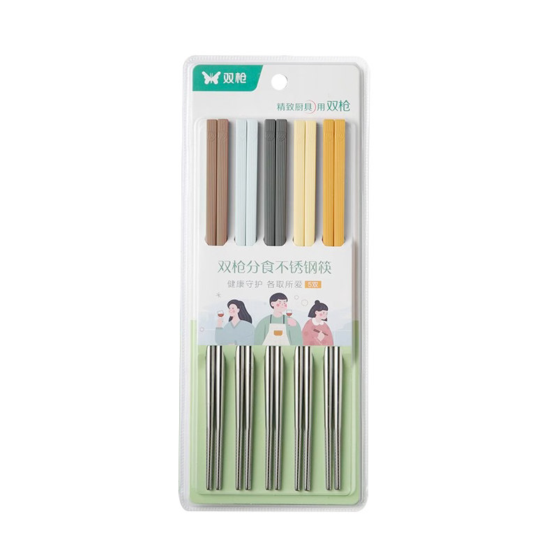双枪304不锈钢筷子家用儿童抗菌筷防滑防霉分色家庭五双装