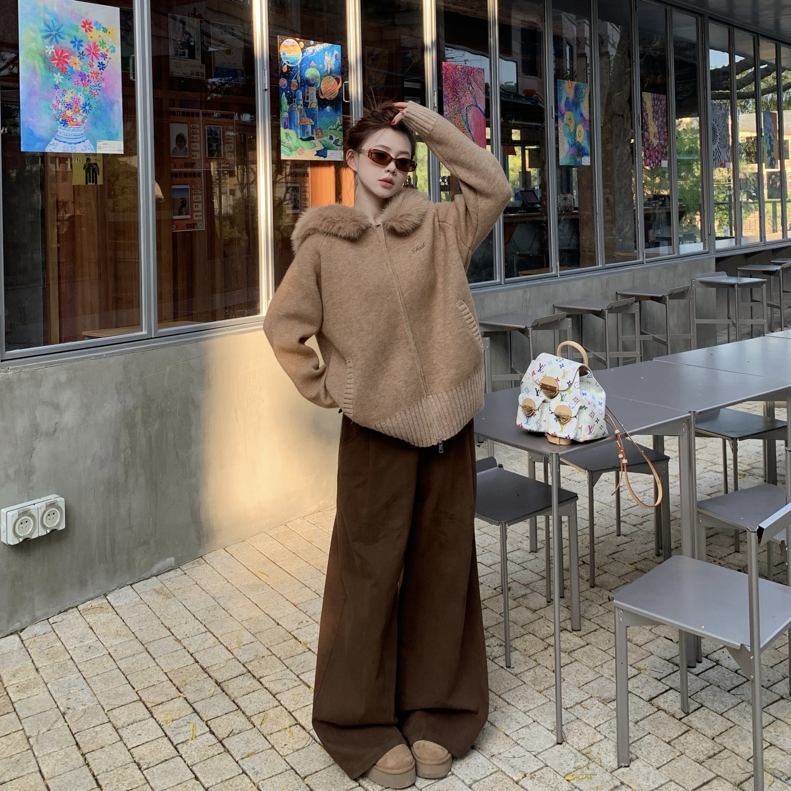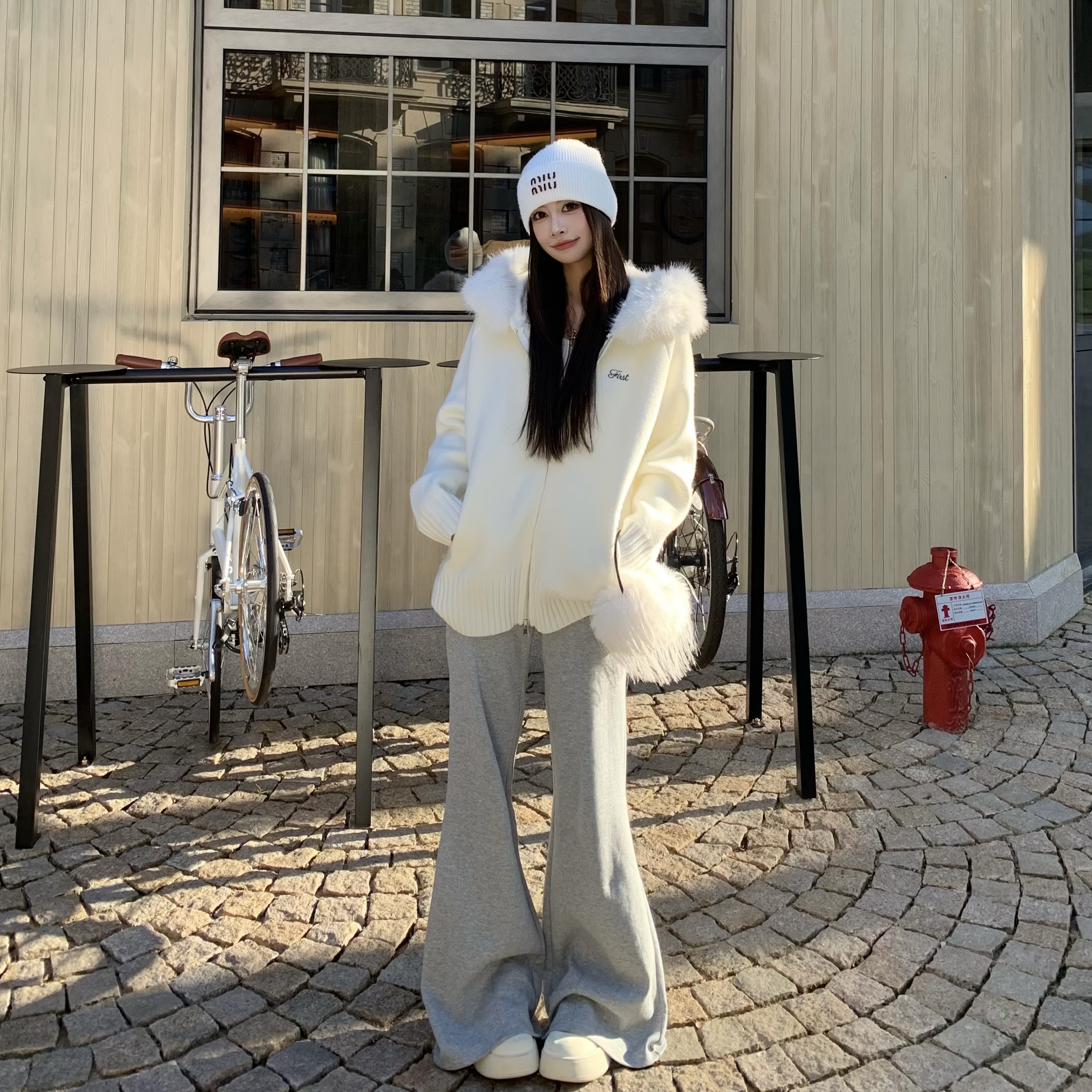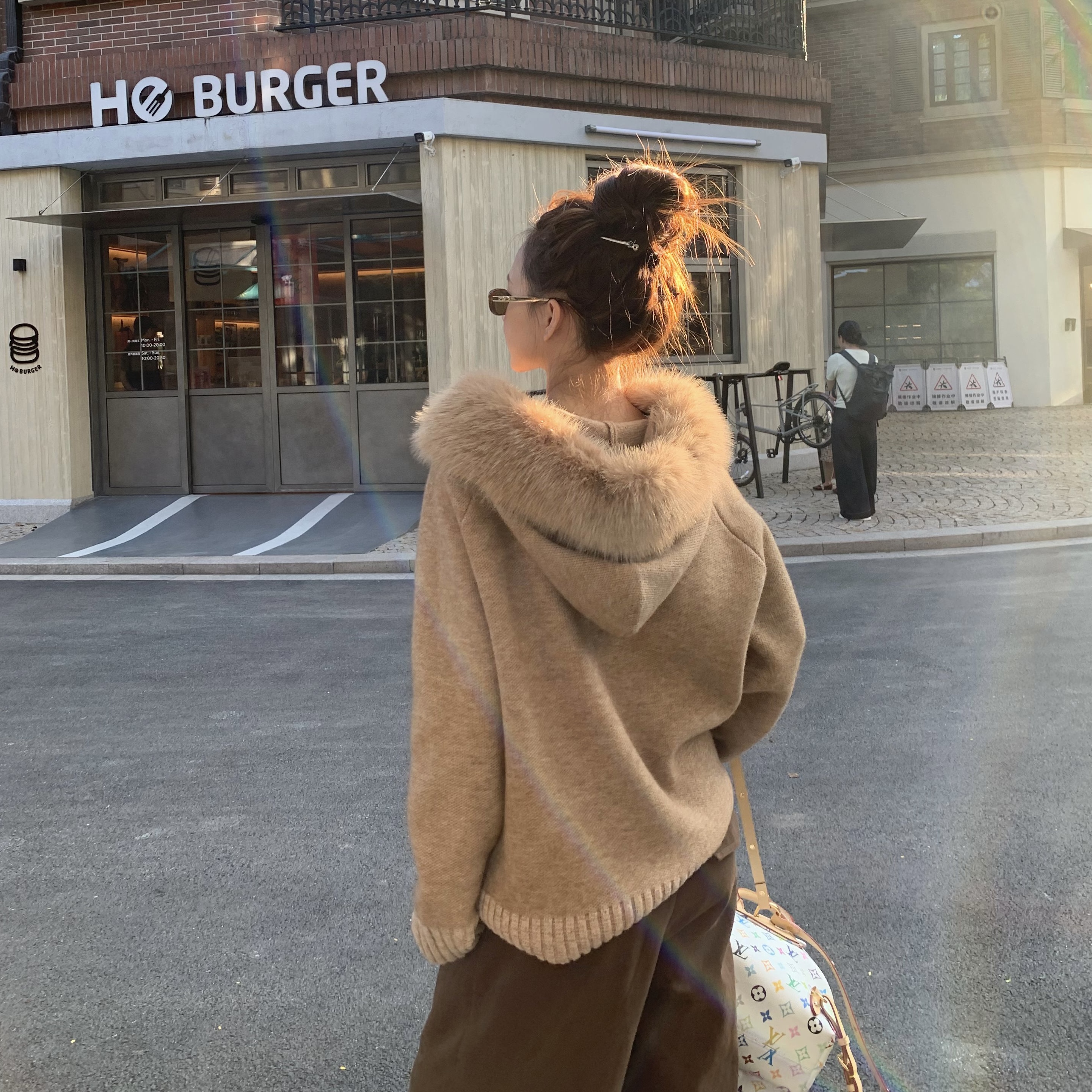 3MER哦哦三妹软糯慵懒风连帽毛领针织开衫女秋冬加厚温柔毛衣外套