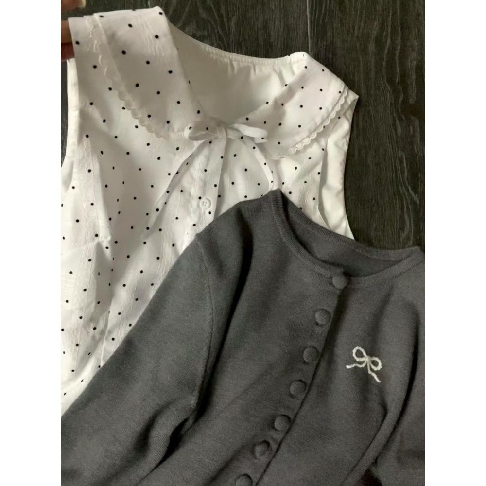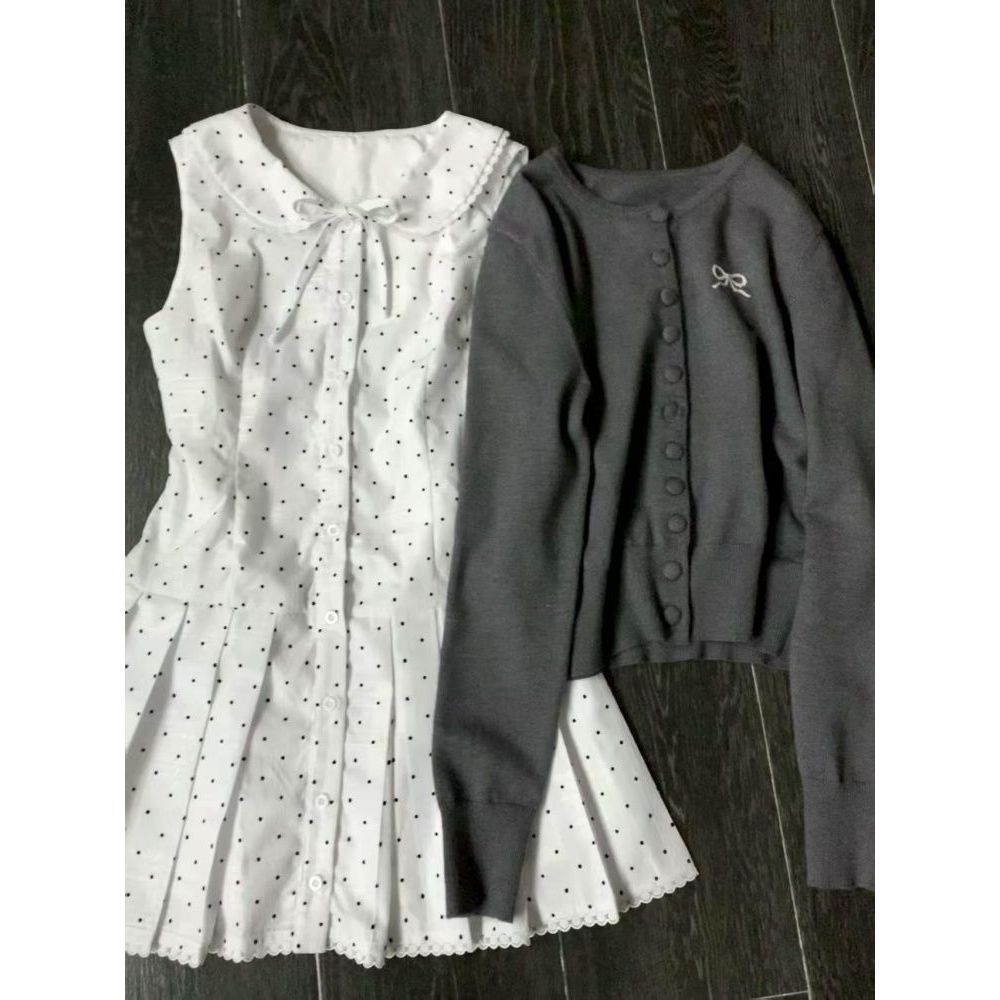 早秋韩系甜美感套装蝴蝶结灰色开衫小众减龄娃娃领波点背心连衣裙