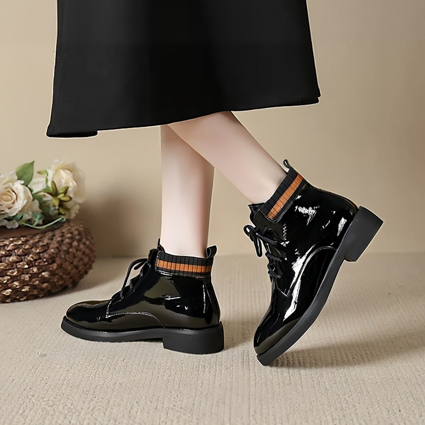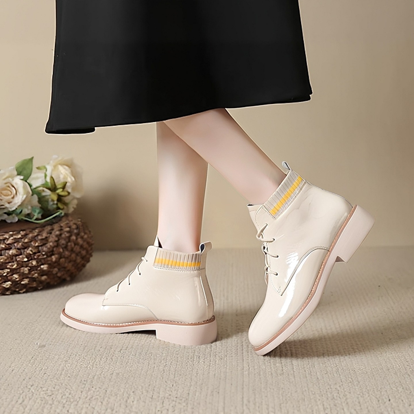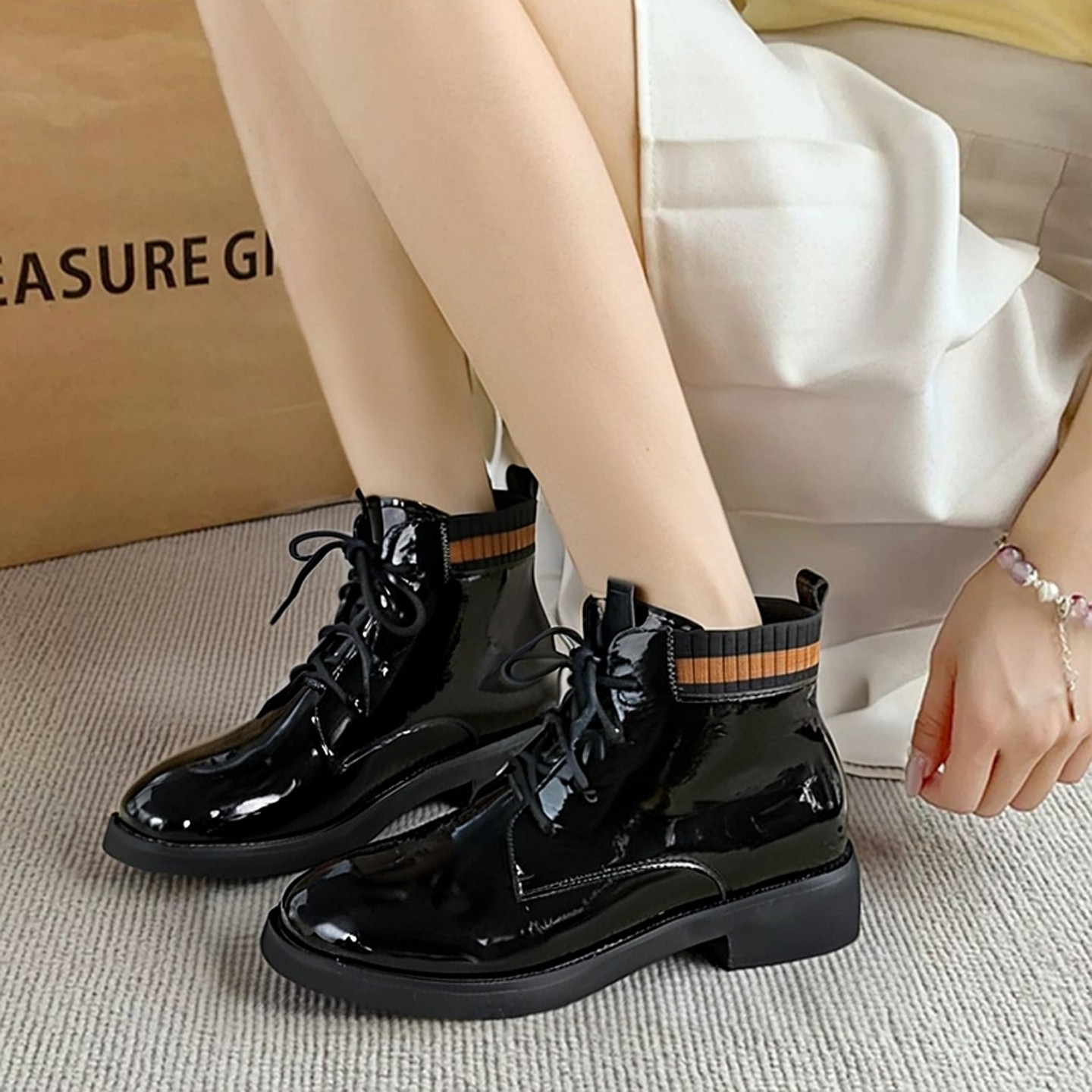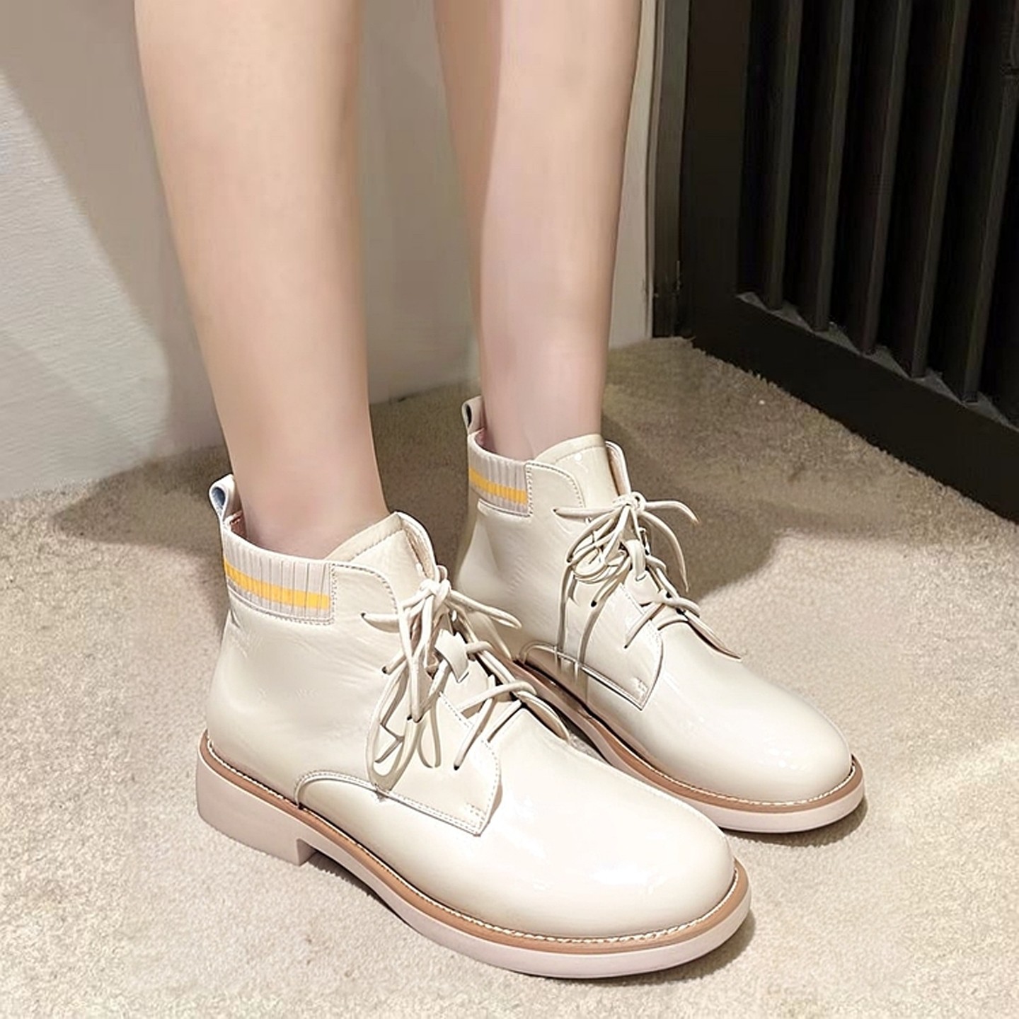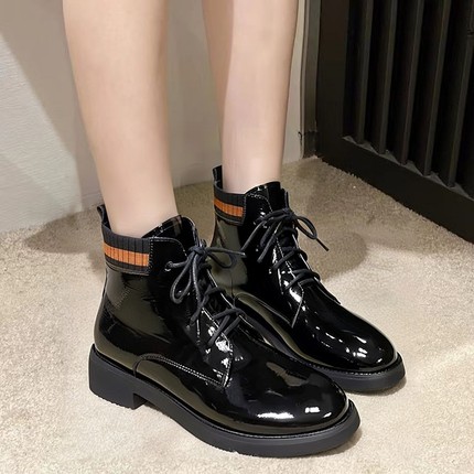 意尔康白色平底短靴春季新款粗跟中跟单靴系带短筒英伦加绒马丁靴