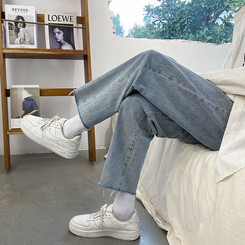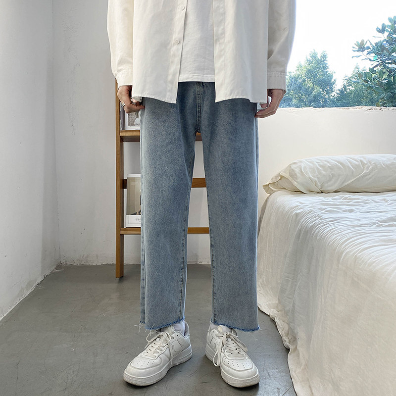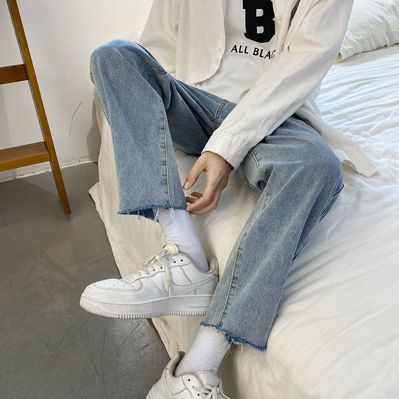 男士小脚牛仔裤男秋季2024年新款毛边直筒裤水洗浅色修身裤子男款