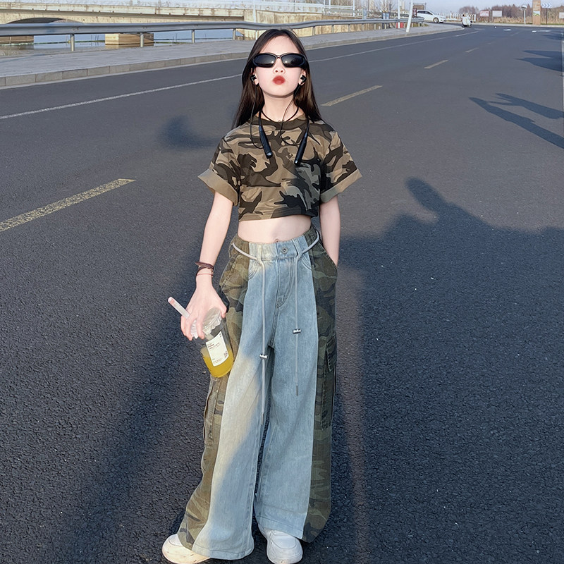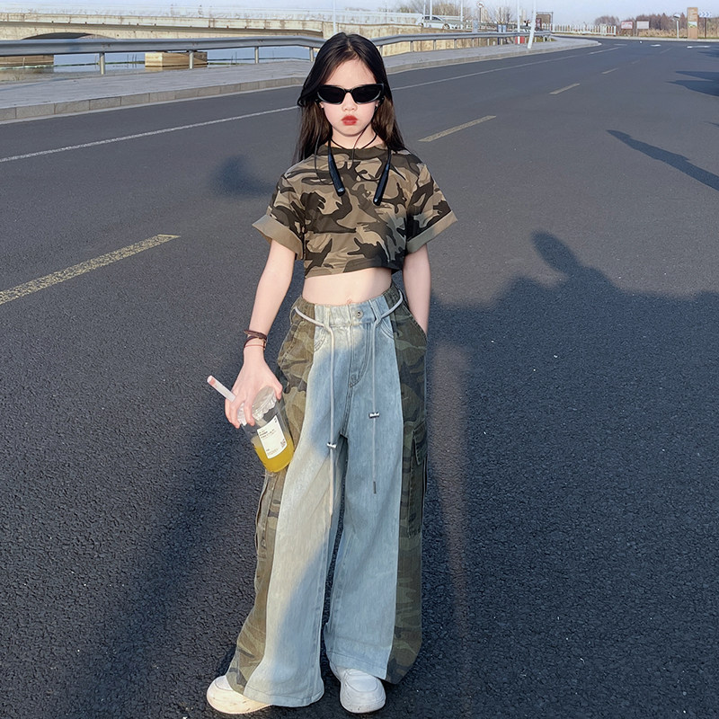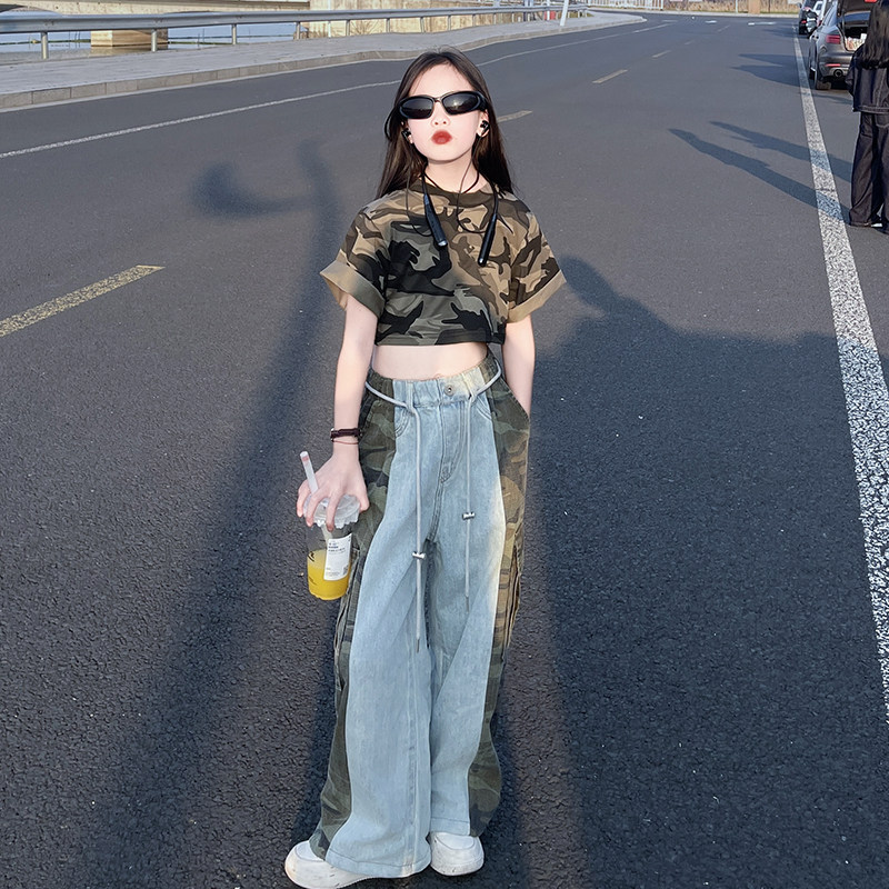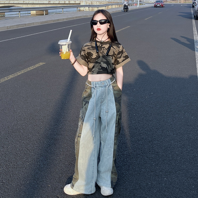 女童迷彩服套装2025春夏新款短袖牛仔拼接长裤中大童表演演出服装