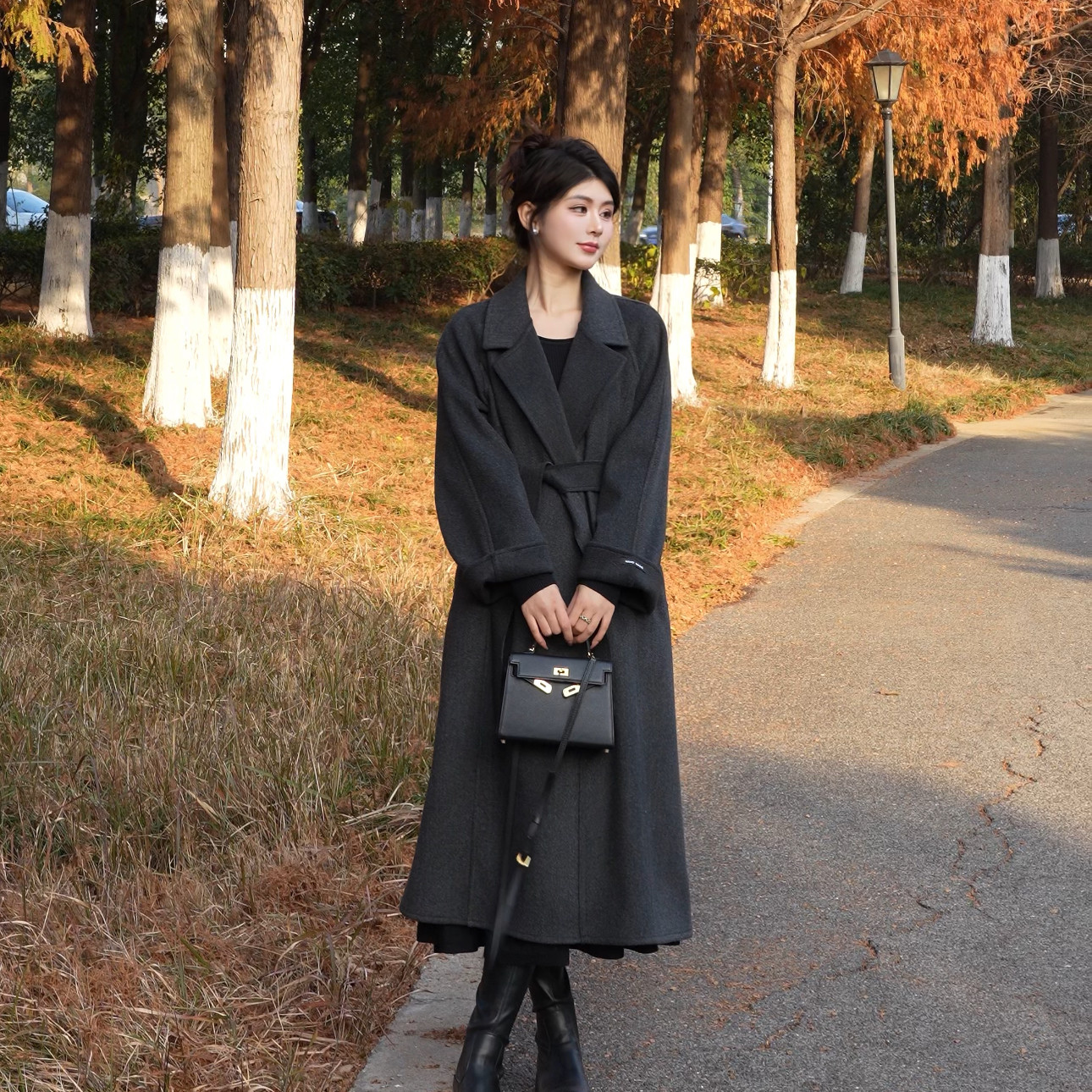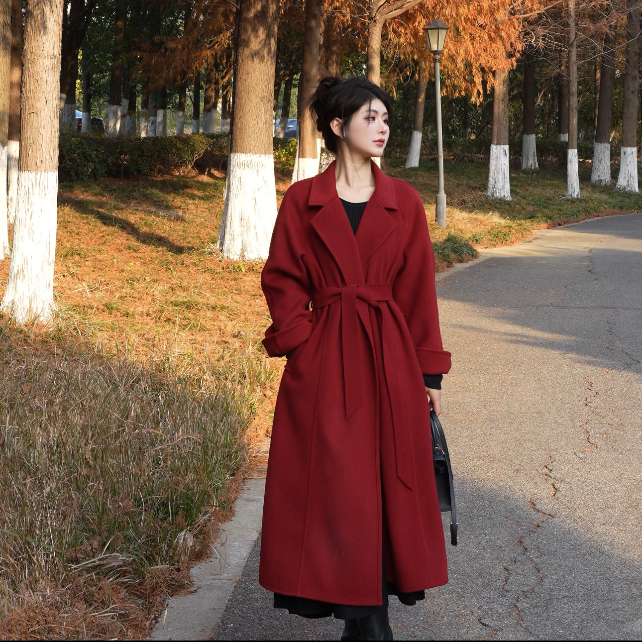 2025秋冬新款双面大衣女中长款西装领系带毛呢外套韩版修身2578