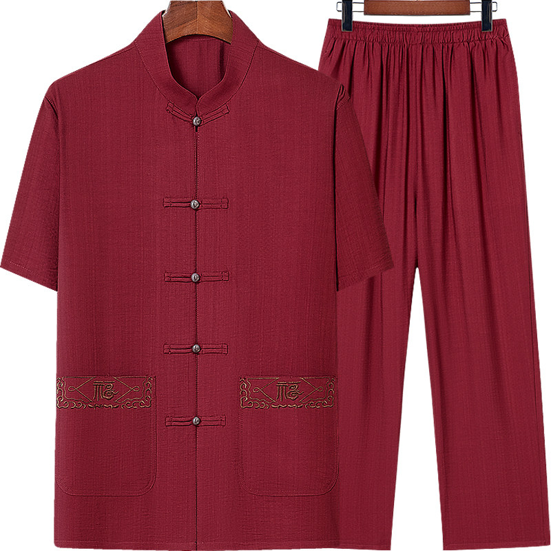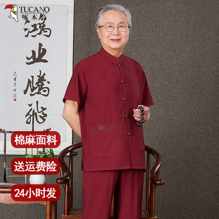 啄木鸟中老年男士棉麻短袖套装夏季爸爸老人过寿红色生日国风唐装