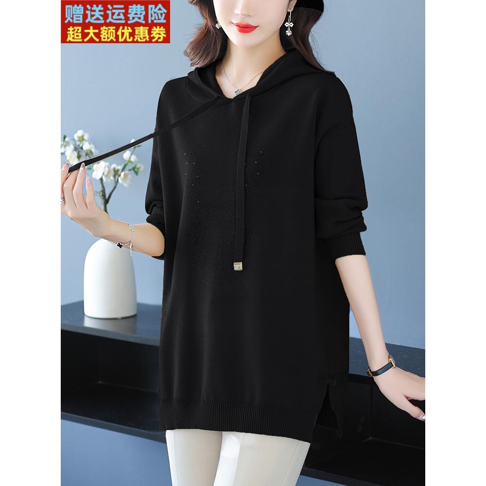 中年妈妈秋冬连帽卫衣中长款毛衣女加肥加大码宽松遮肚打底针织衫