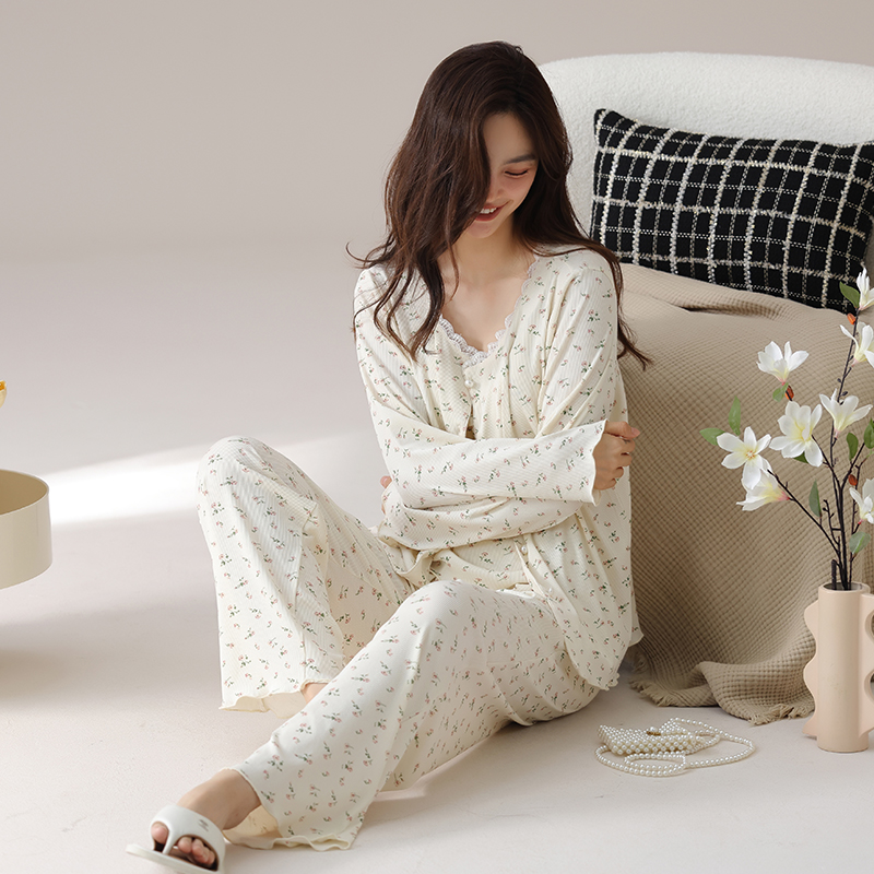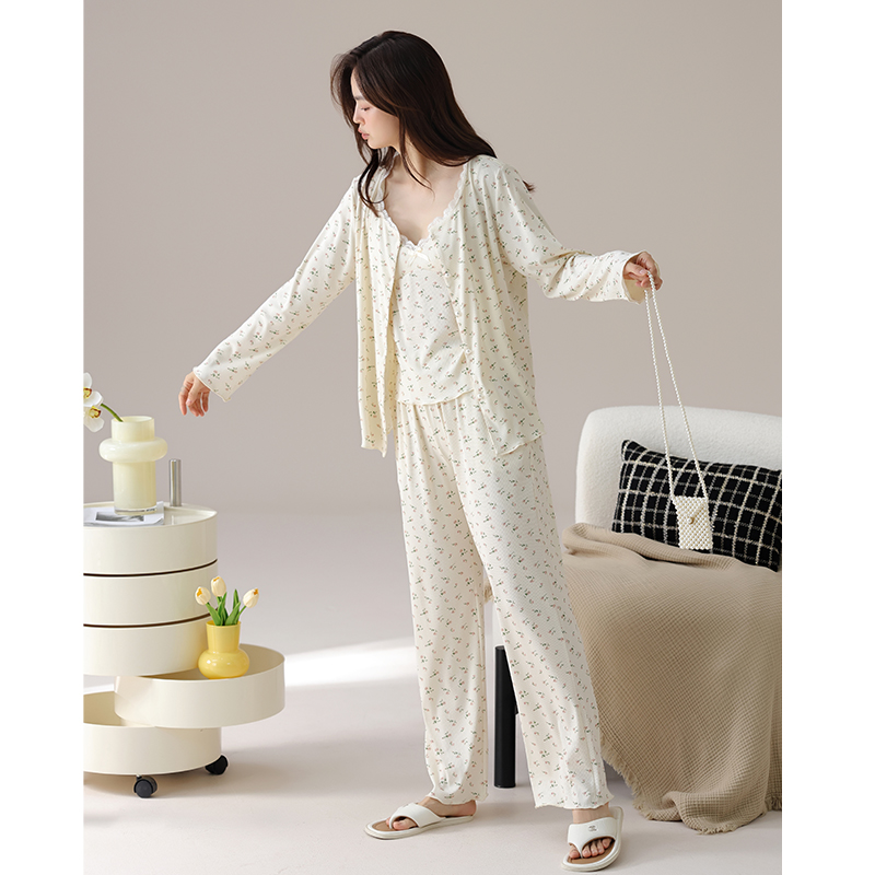 猫人带胸垫睡衣女款春秋款纯棉长袖2025新款吊带三件套性感家居服