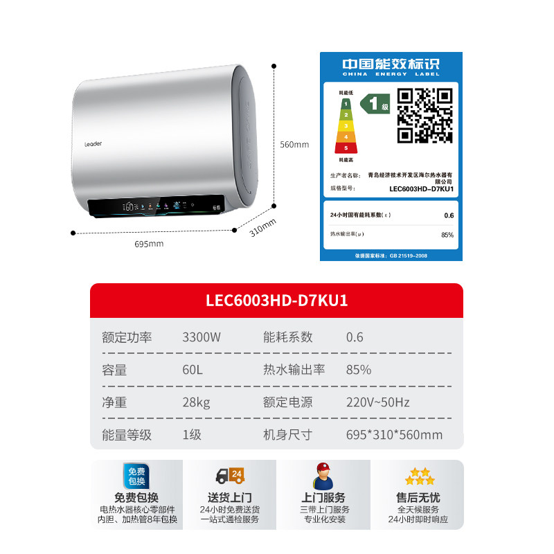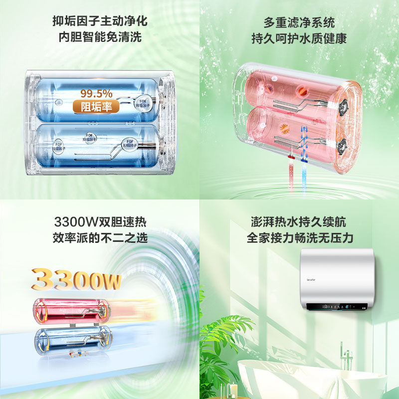 海尔智家统帅电热水器60升双胆家用卫生间洗澡免清洗扁桶一级能效