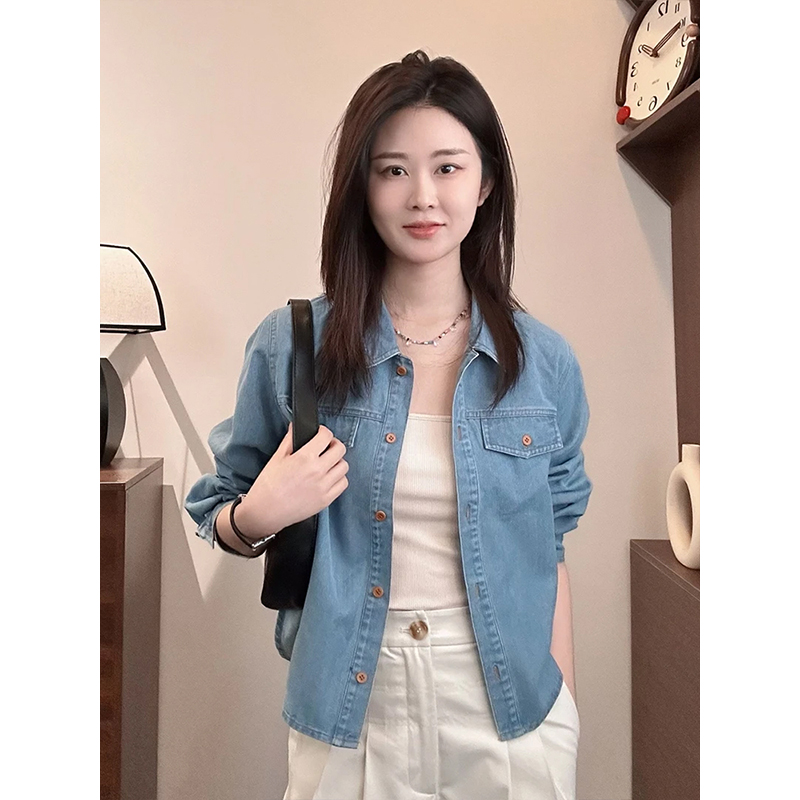 休闲百搭翻领复古牛仔衬衫女2025春季新款外搭开衫短款薄外套上衣