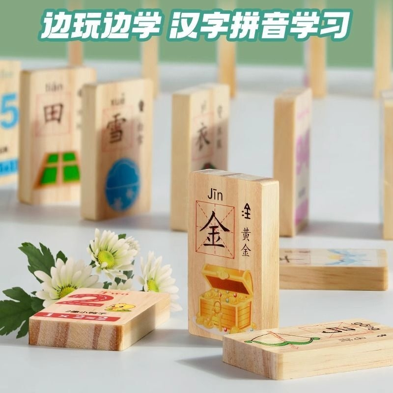 儿童早教识字积木玩具木质多米诺骨牌益智力男女孩认汉字幼儿数字