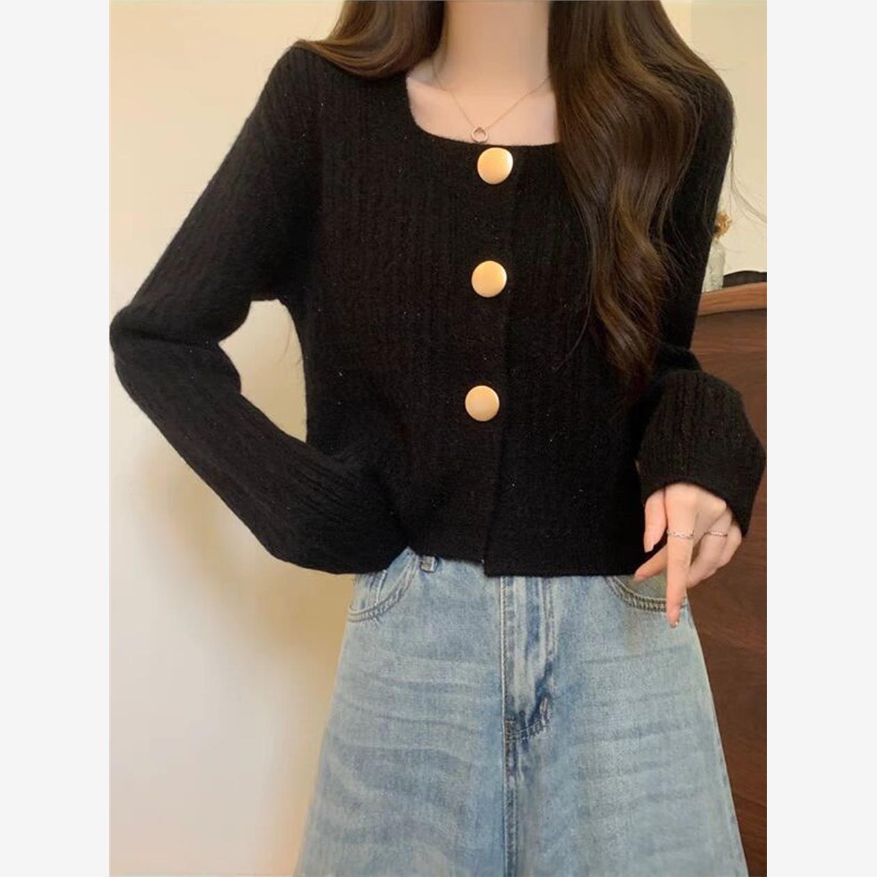 别致独特方领宽松短款毛衣开衫外套女春秋2025新款小个子针织上衣