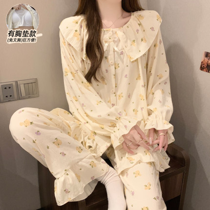 睡衣女春秋带胸垫一体纯棉云朵棉长袖套装家居服可爱甜美公主风