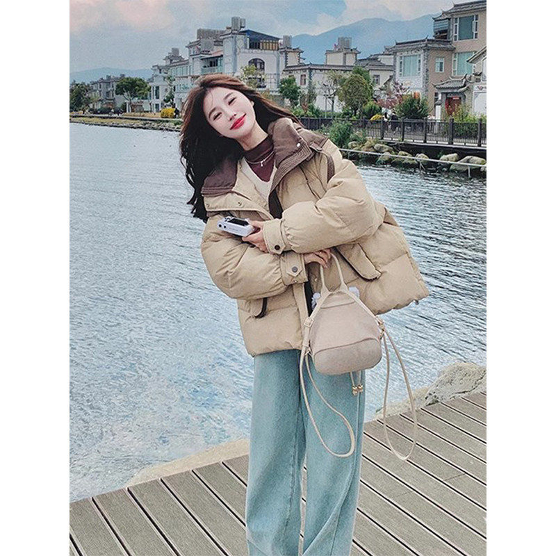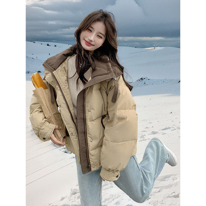 300斤大码女装胖mm韩系设计感棉服女新款拼接卡其色加厚冬装外套