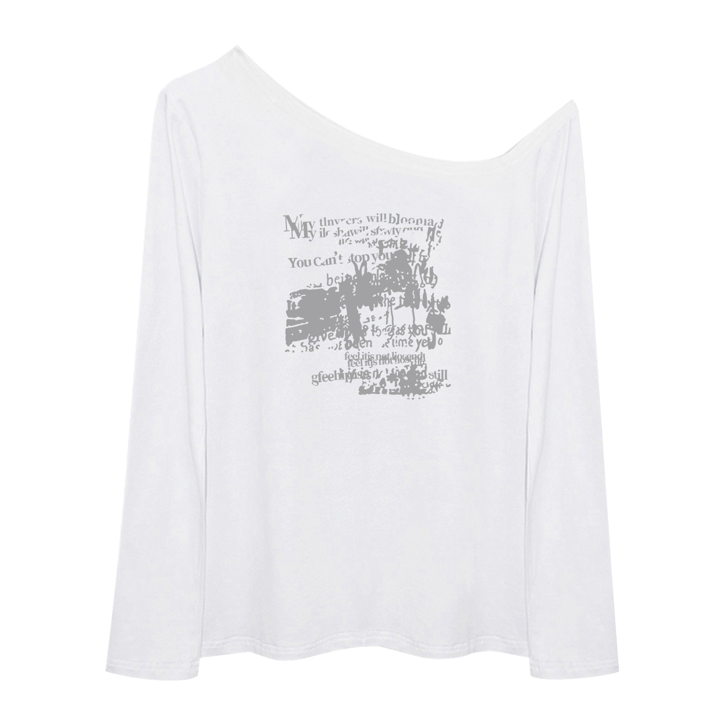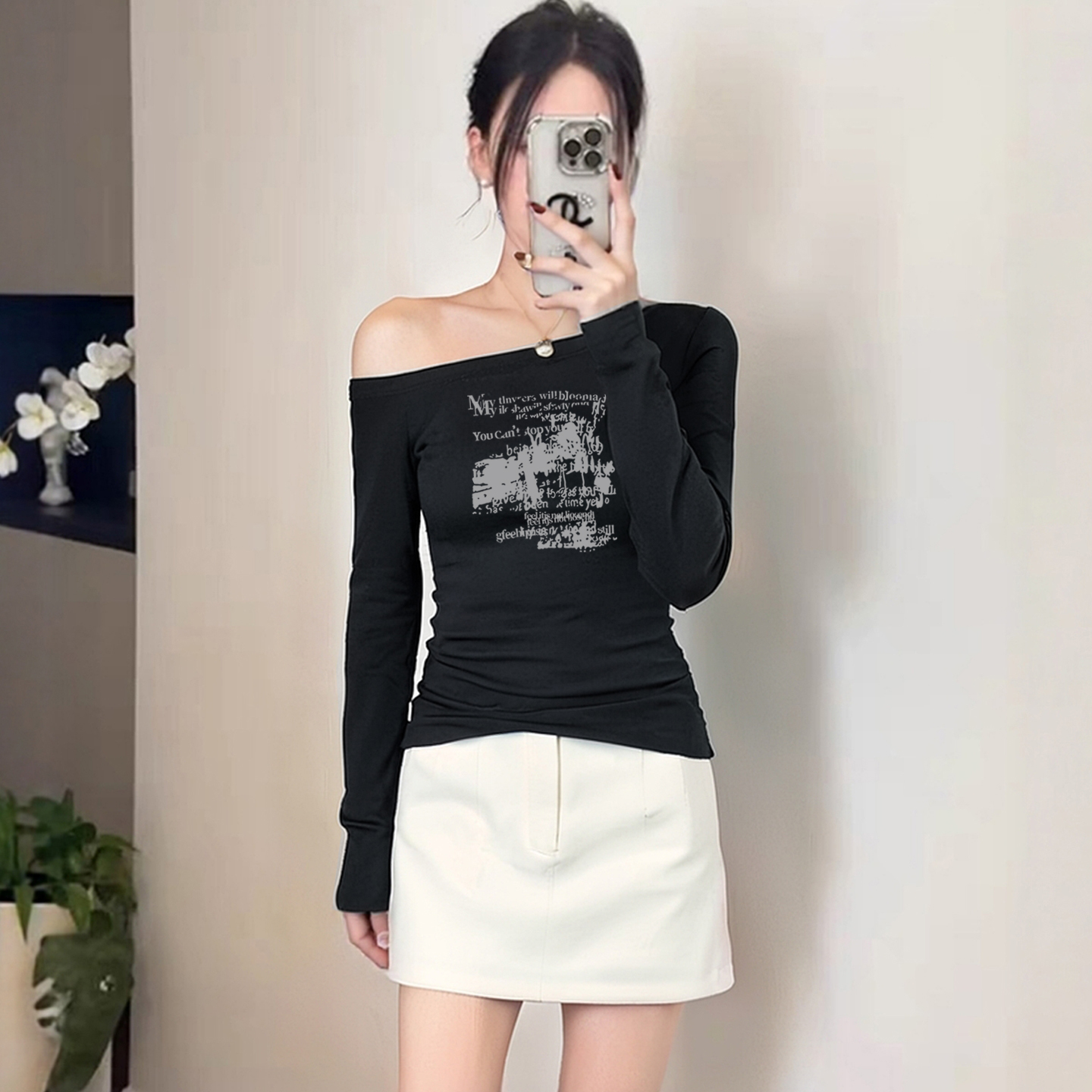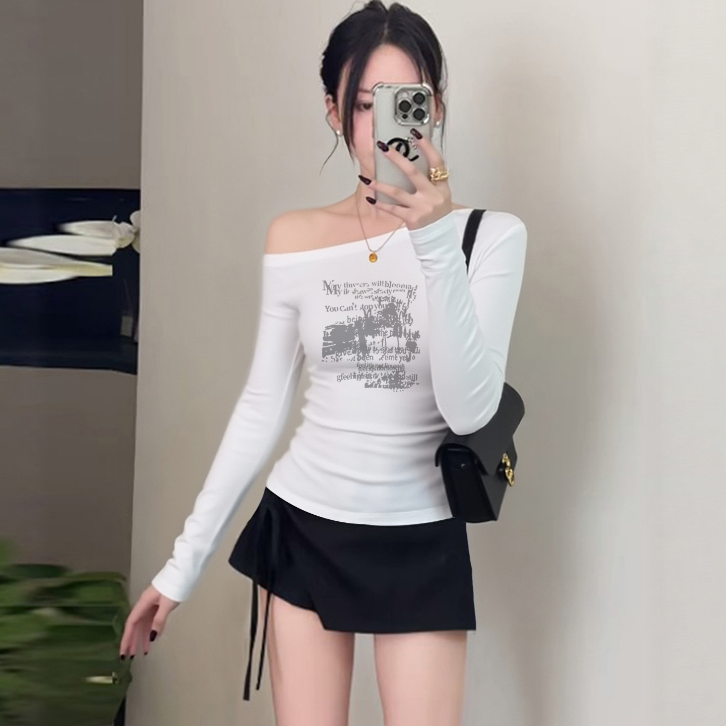 美式性感修身斜肩长袖t恤女2025秋季新款白色内搭紧身显瘦打底衫
