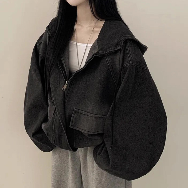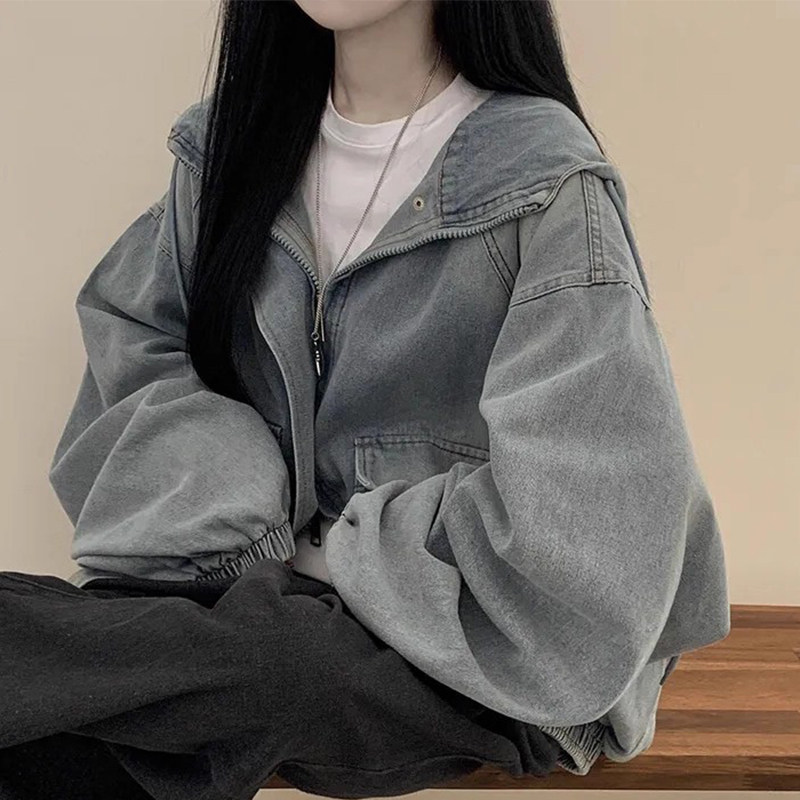 韩国chic秋季新款法式慵懒风双拉链大口袋短款连帽牛仔卫衣外套女