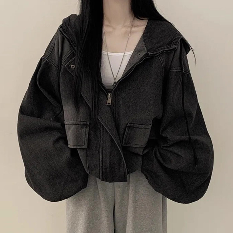 大口袋短款连帽牛仔卫衣外套