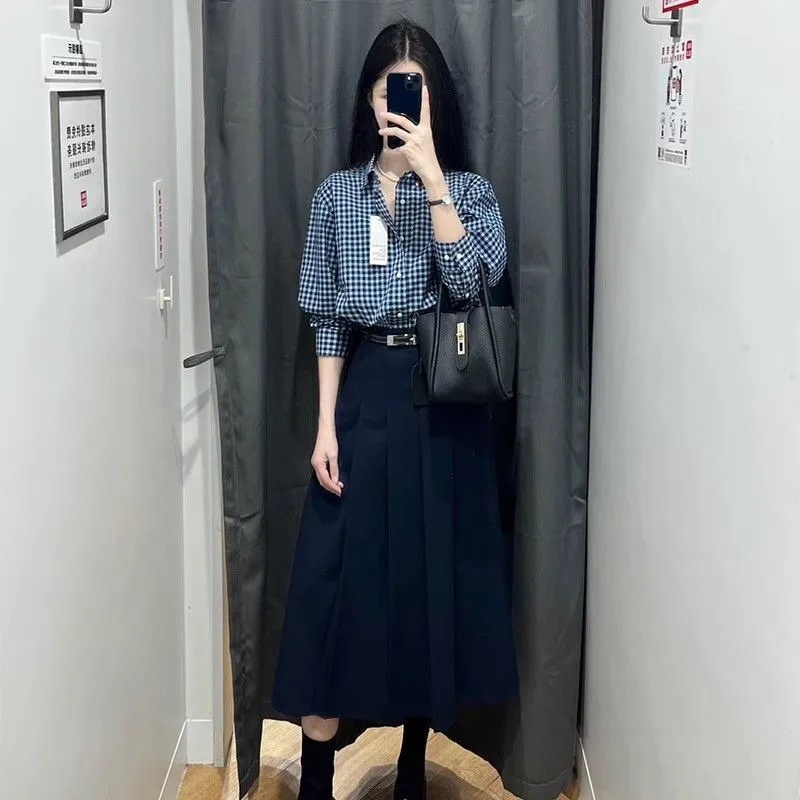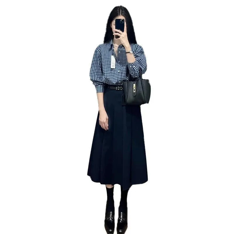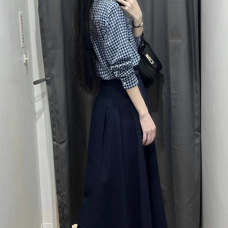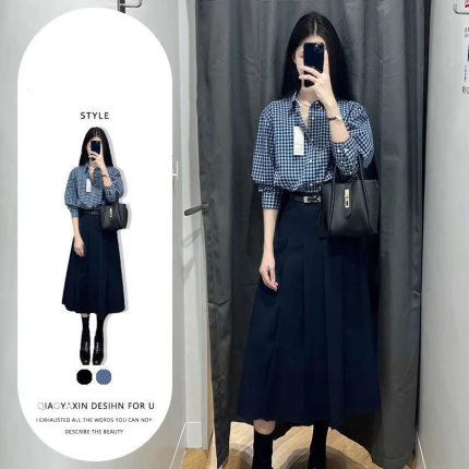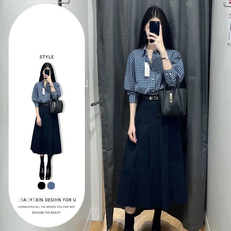 单件/可甜可盐炸街女秋季新款设计感中长款百褶裙法式格子衬衫潮