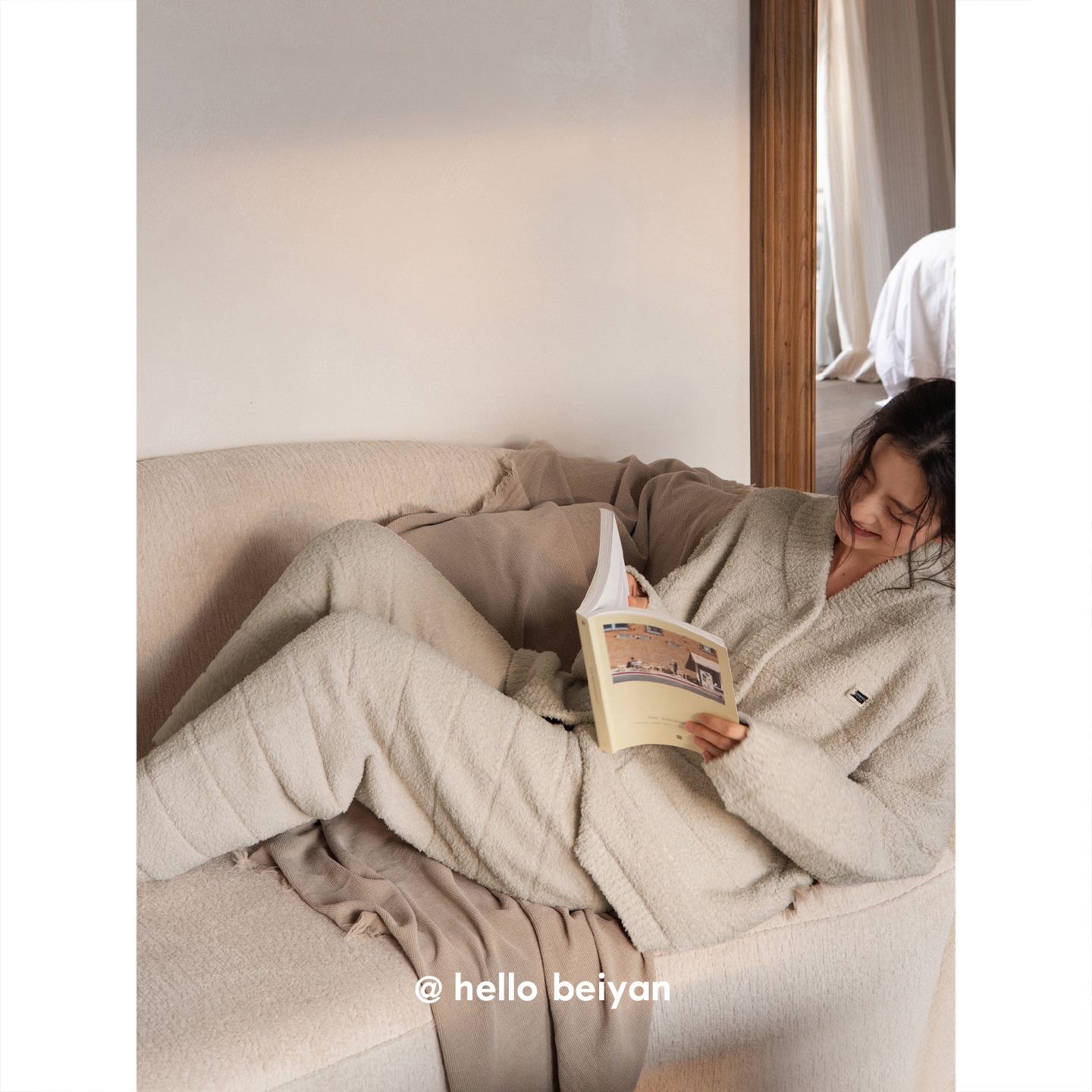 贝妍女冬V领开衫半边绒慵懒睡衣
