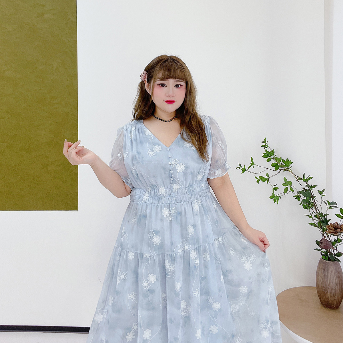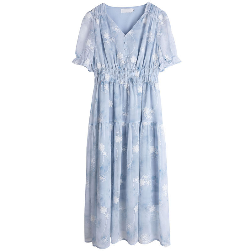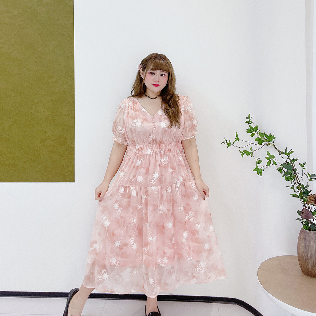 重工刺绣高级感雪纺长裙胖莹莹大码女装泡泡袖气质v领碎花连衣裙