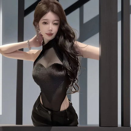 网红拼接网纱吊带连体衣辣妹露肩纯欲上衣小众修身背心打底女夏