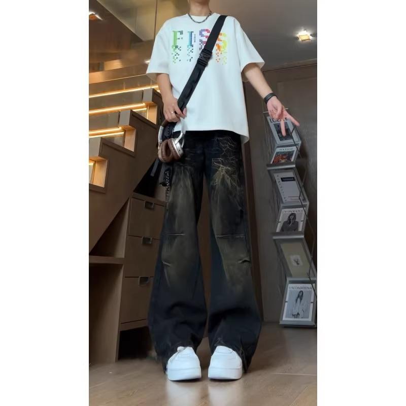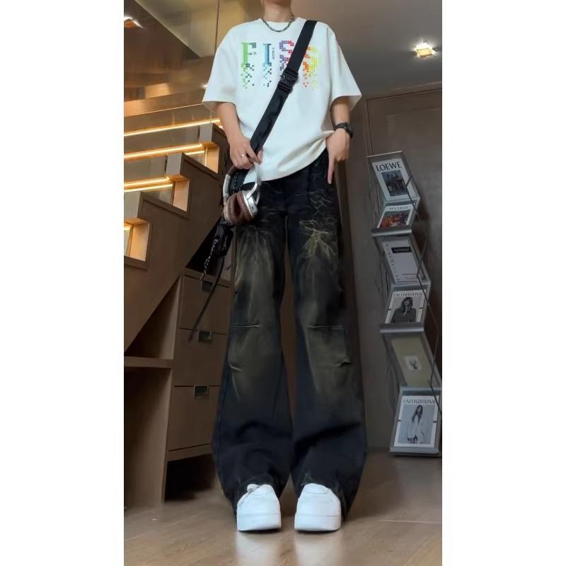 闪电纹高腰直筒牛仔裤男款高个子加长裤子美式高街vibe微喇阔腿裤