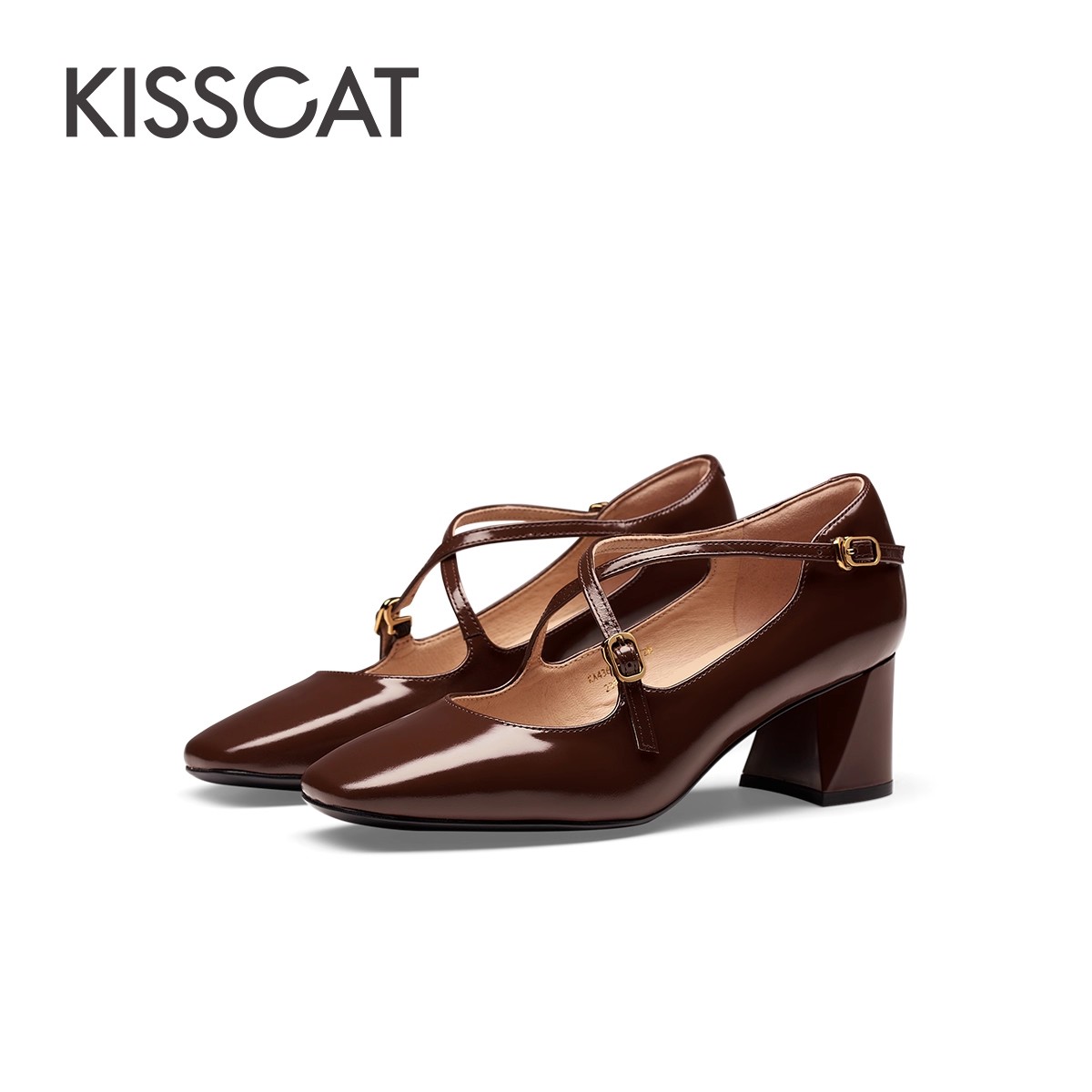 KISSCAT接吻猫秋季新款交叉带复古玛丽珍鞋女粗跟通勤时装单鞋女