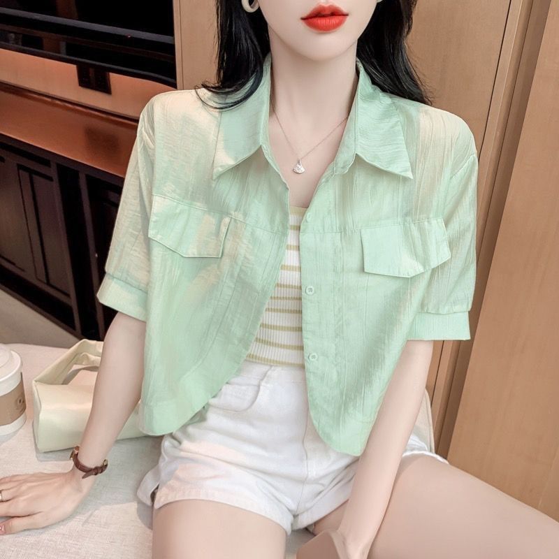 白色polo领短袖短款衬衫防晒衣女夏季外搭开衫小个子宽松雪纺上衣