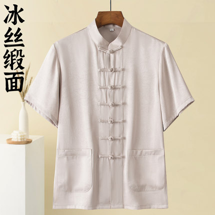 唐装男夏季薄款短袖冰丝衬衫中国风男装中老年中式复古盘扣爸爸装