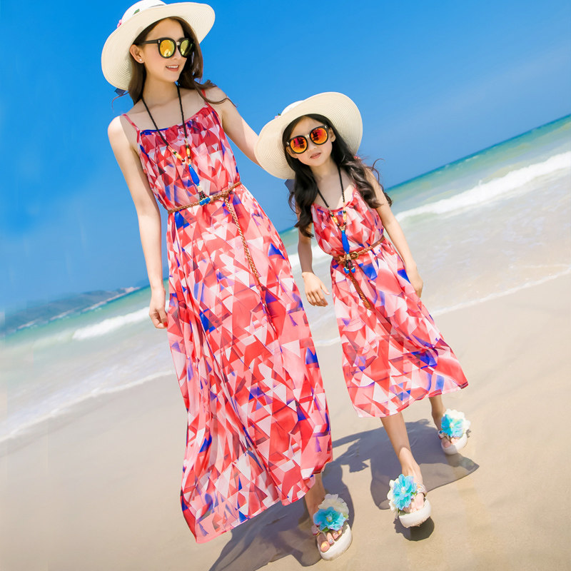 亲子装海边度假沙滩裙母女装海岛出游连衣裙雪纺吊带长裙大码显瘦