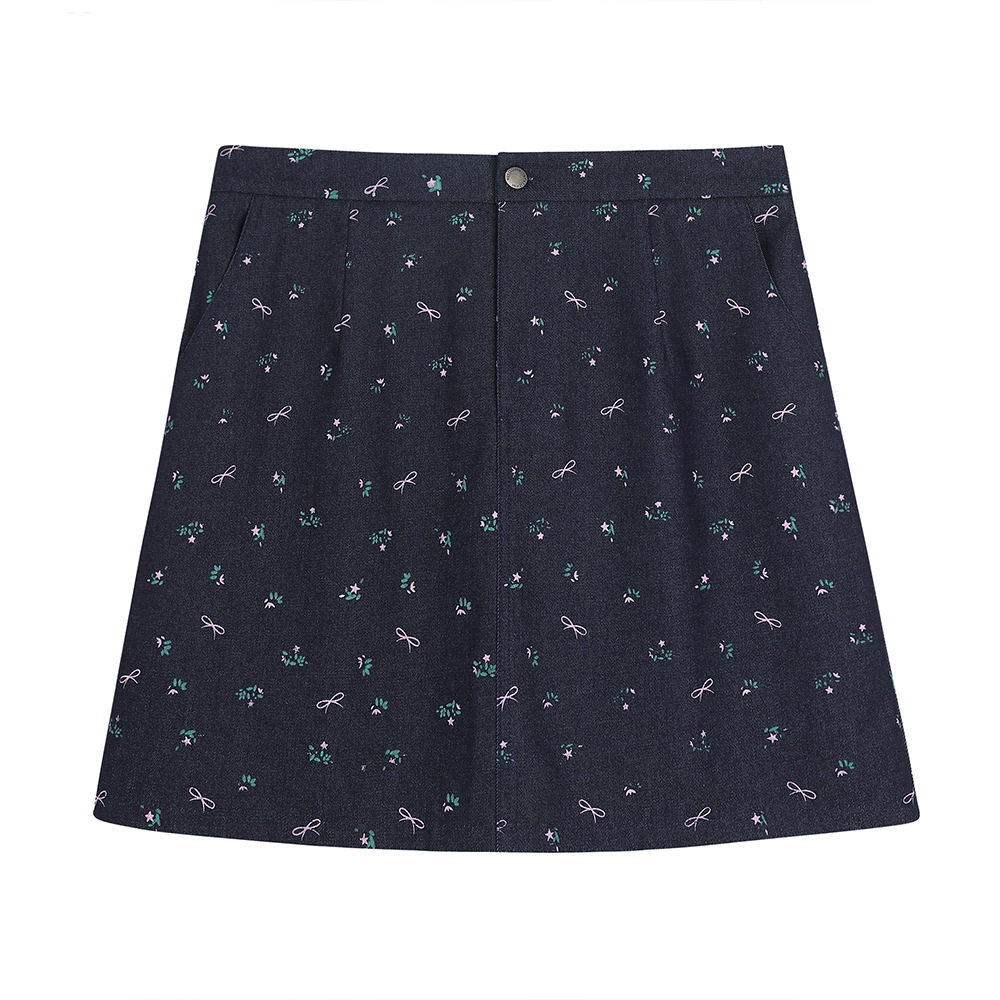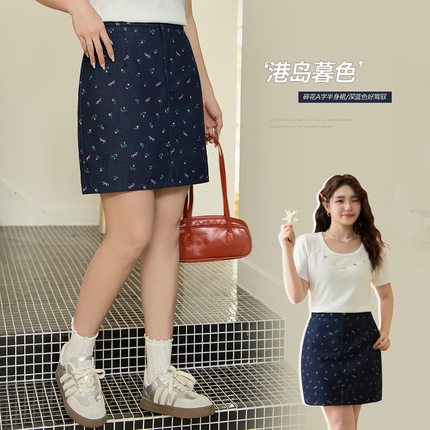大碼女裝 碎花蝴蝶結牛仔短裙 微胖mm高腰顯瘦A字半身裙