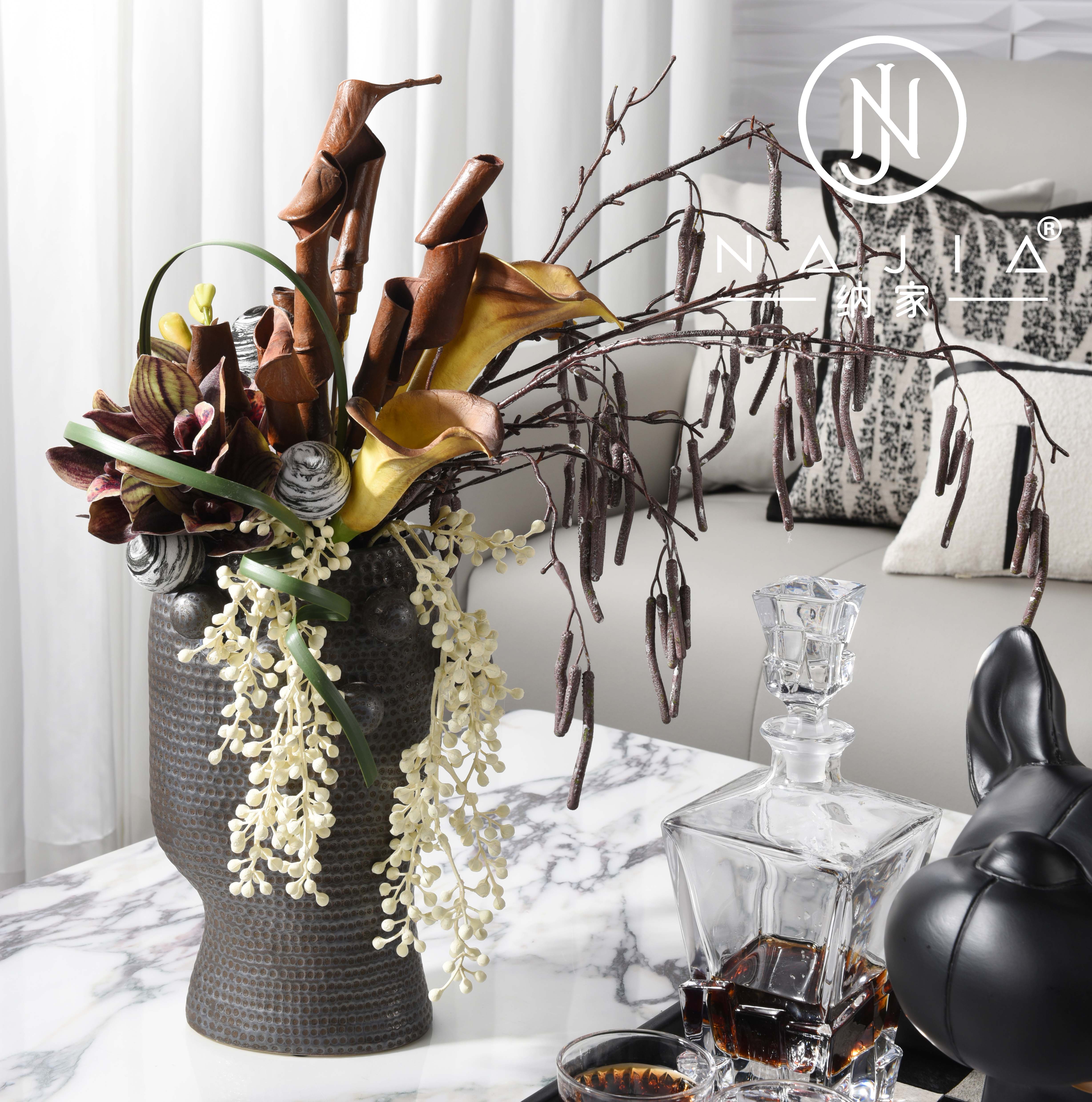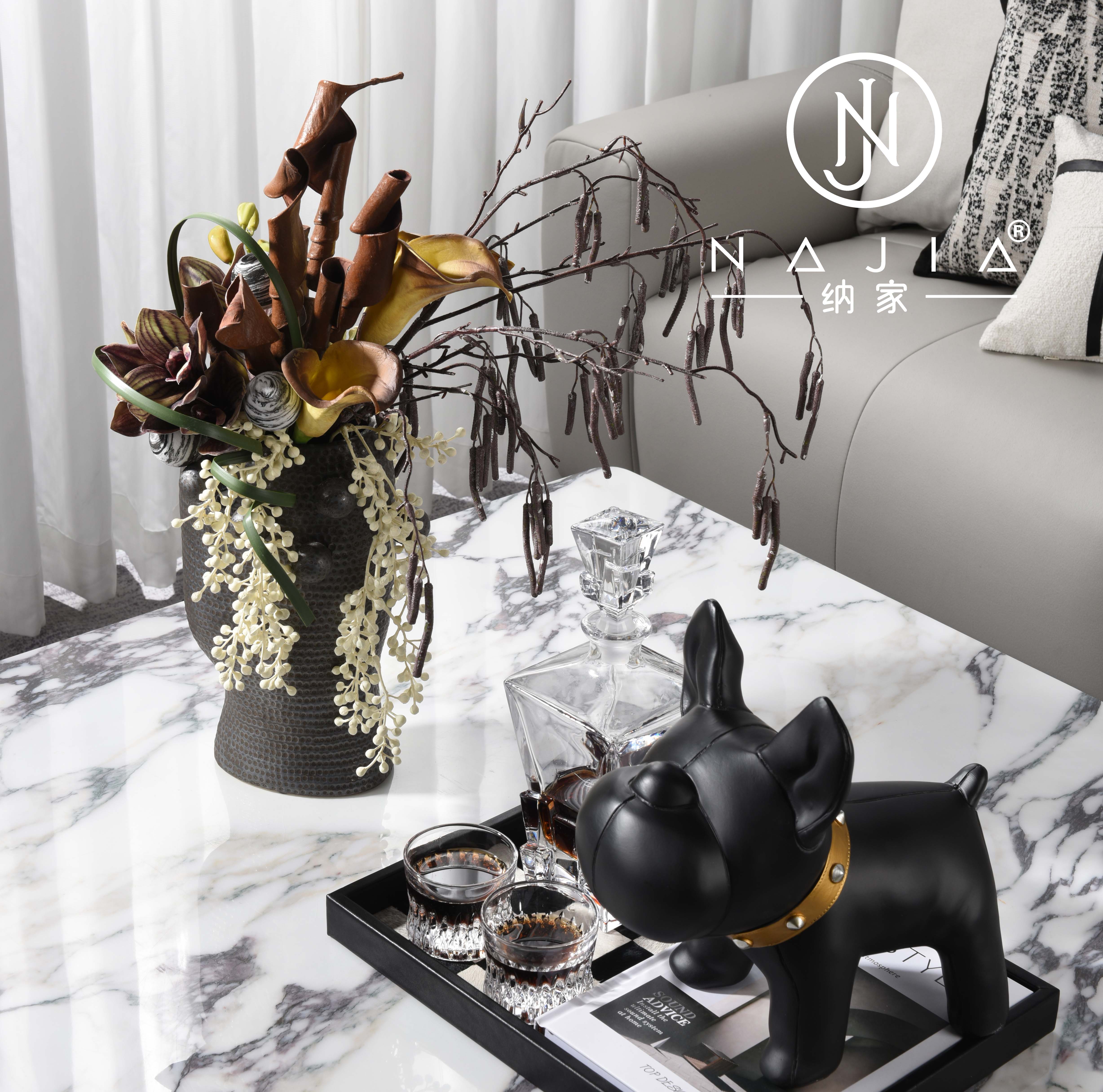 罗曼提现代样板间花艺马毛棋盘格托盘卡通狗摆件客厅茶几饰品组合