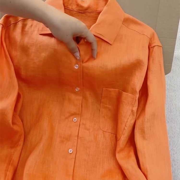 亮橘色翻领单排扣亚麻防晒衬衫女