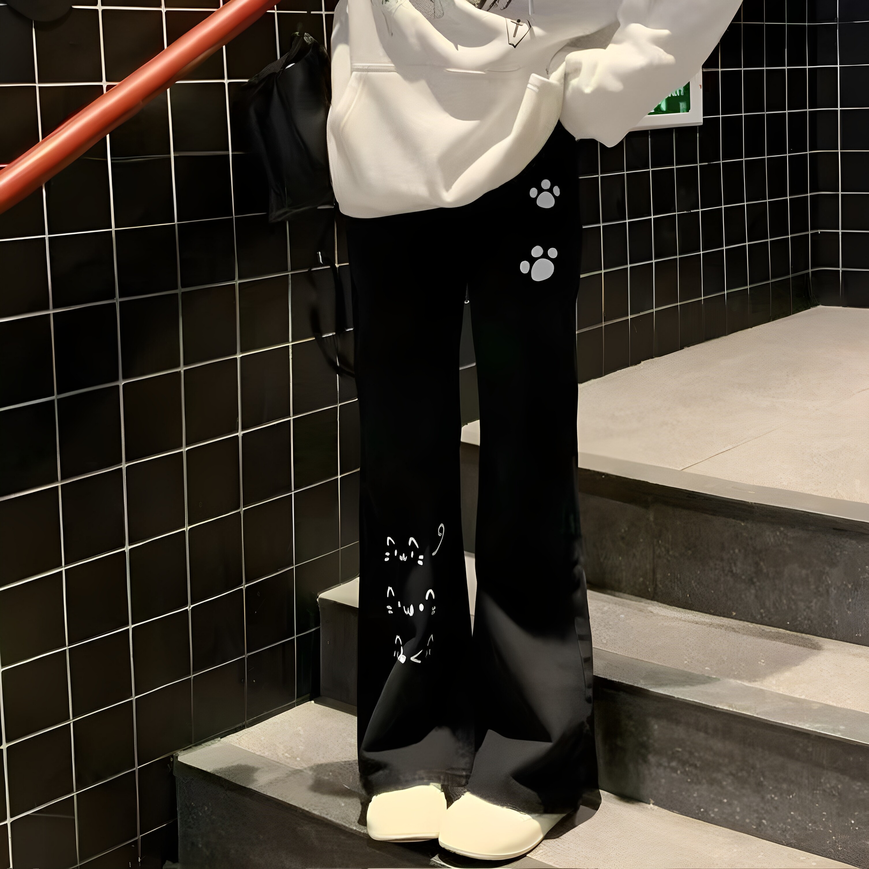 宅系萌系日系猫咪卡通可爱长裤加绒二次元显瘦宽松百搭微喇长裤女