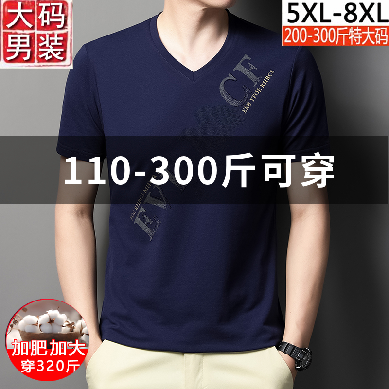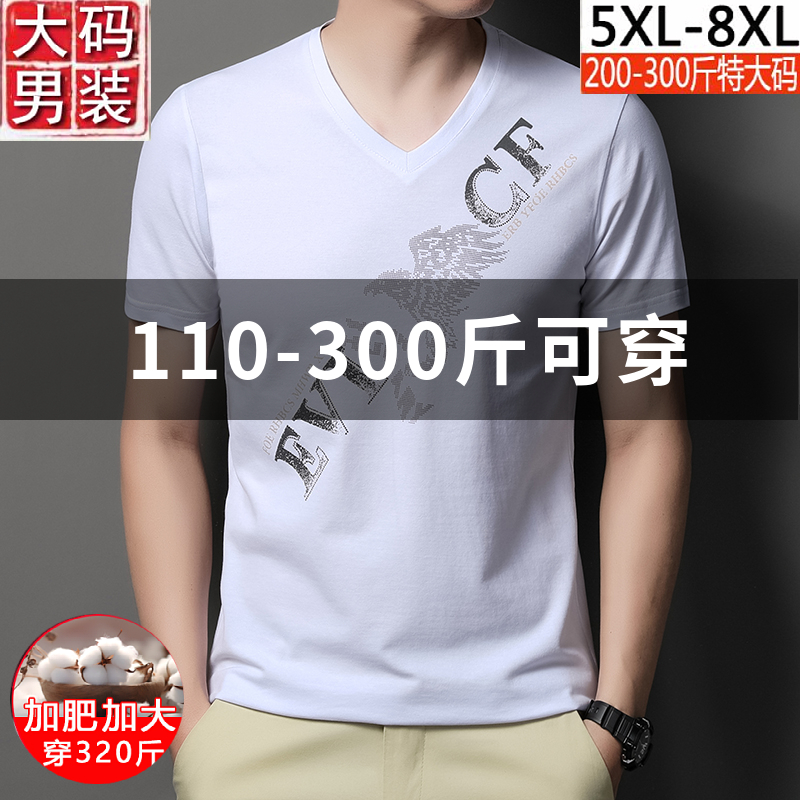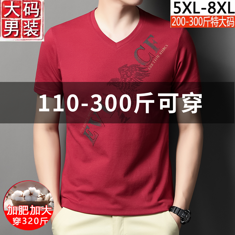 200-300斤特大码男装加肥加大V领印花短袖t恤男胖子纯棉半袖上衣