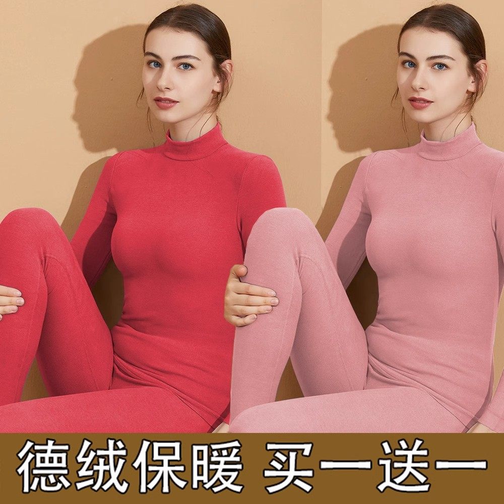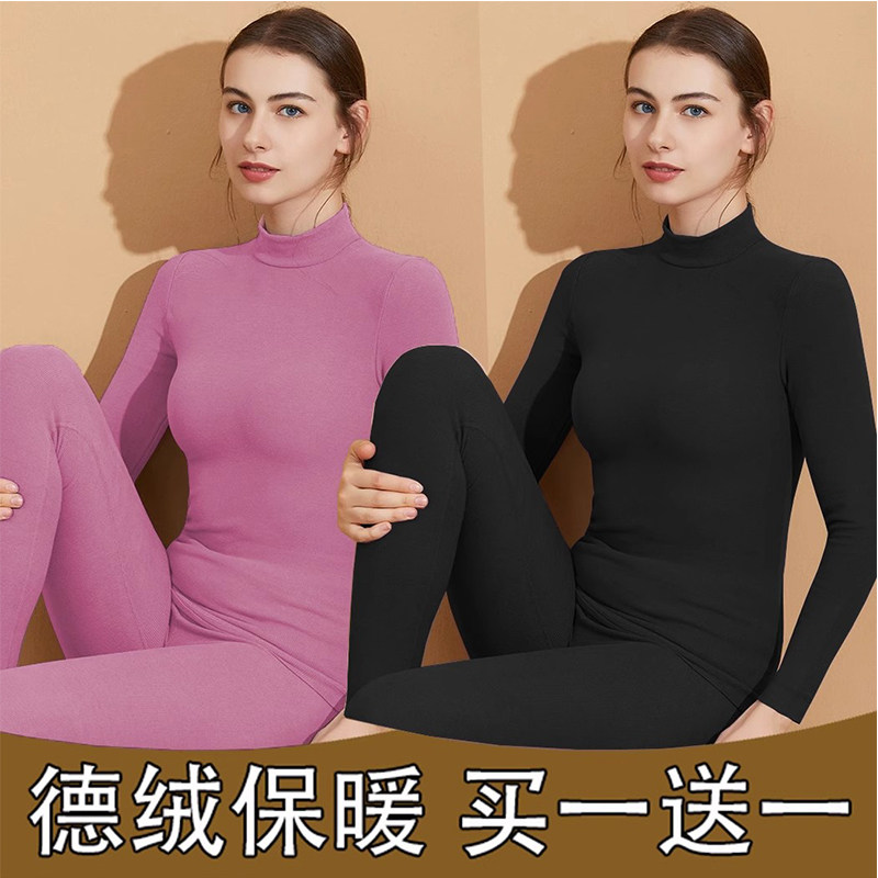 冬天37°自发热德绒保暖内衣女士半高领修身加绒加厚秋衣秋裤套装
