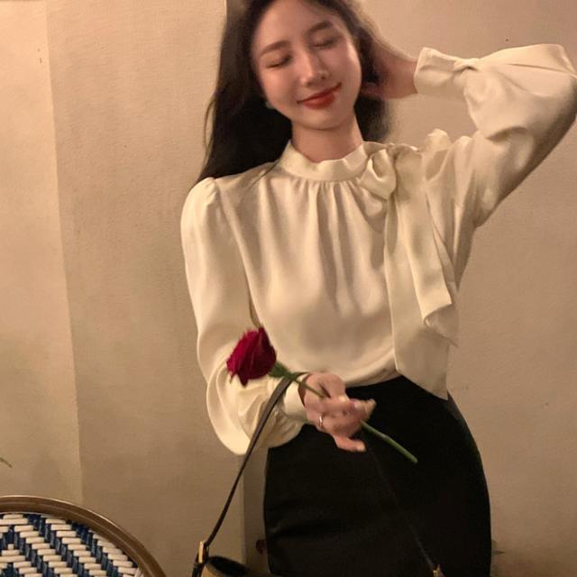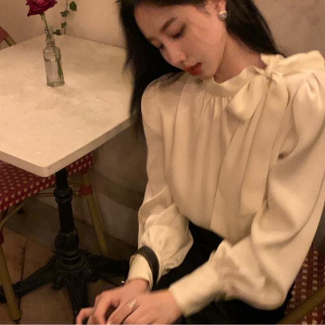 【8936】蝴蝶结缎面衬衫女早秋新款立领褶皱灯笼袖别致漂亮洋气上