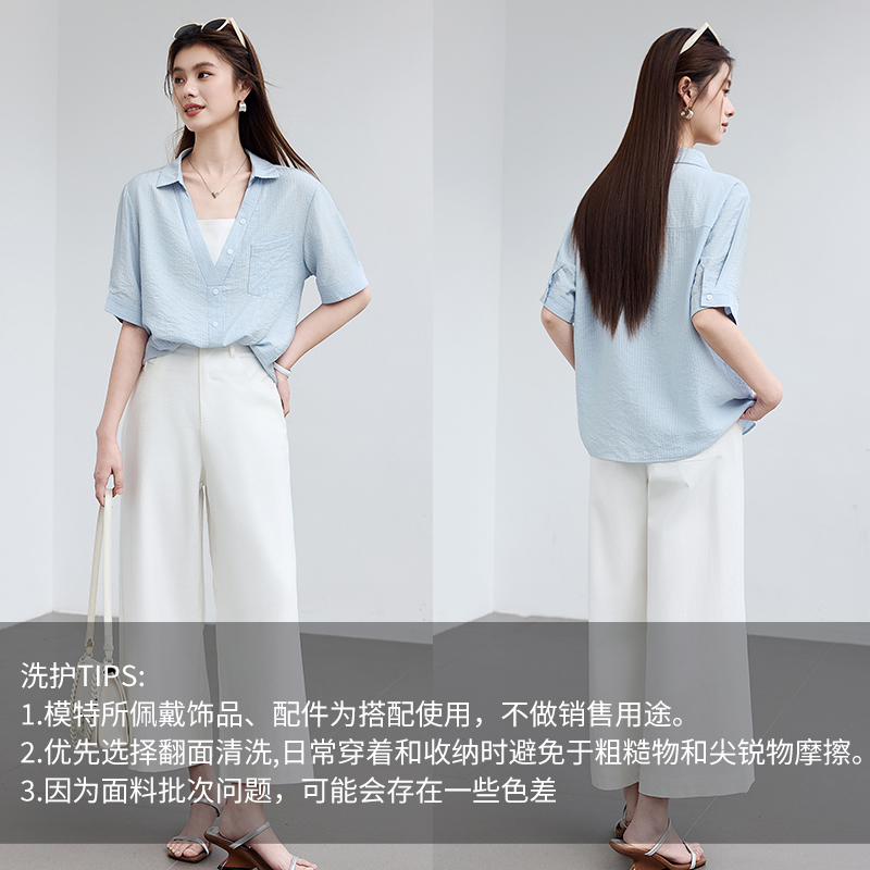 2025新款衬衫女夏季短袖翻领假两件上衣薄款宽松显瘦百搭条纹衬衣