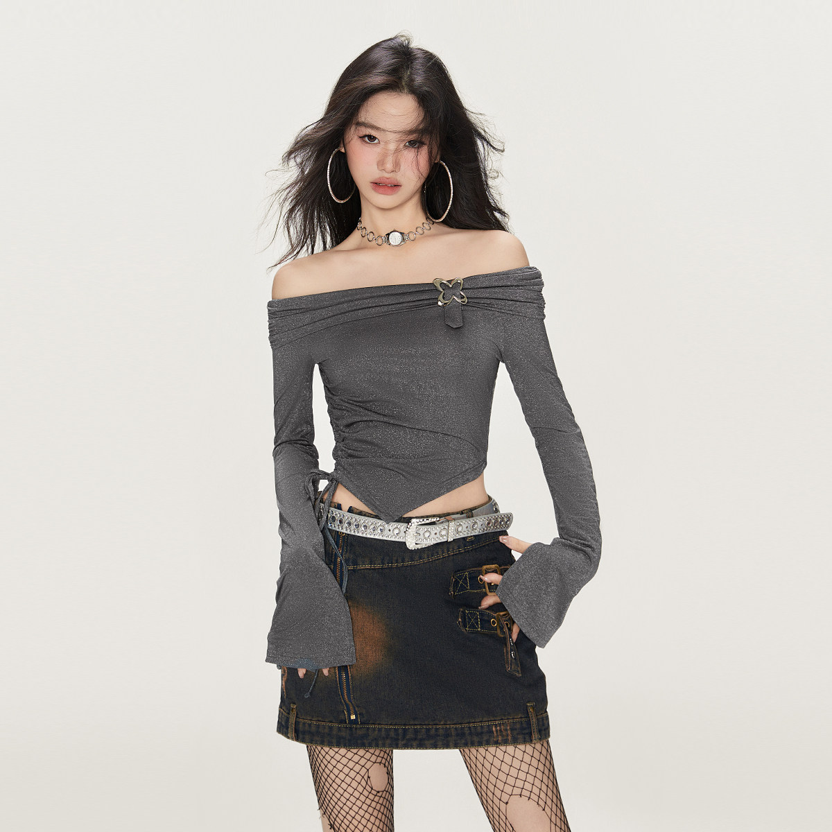 EPTISON长袖T恤女2025秋季新款修身短款设计感一字领辣妹时尚上衣