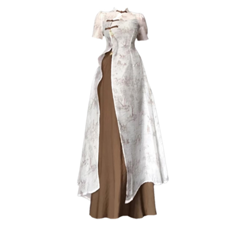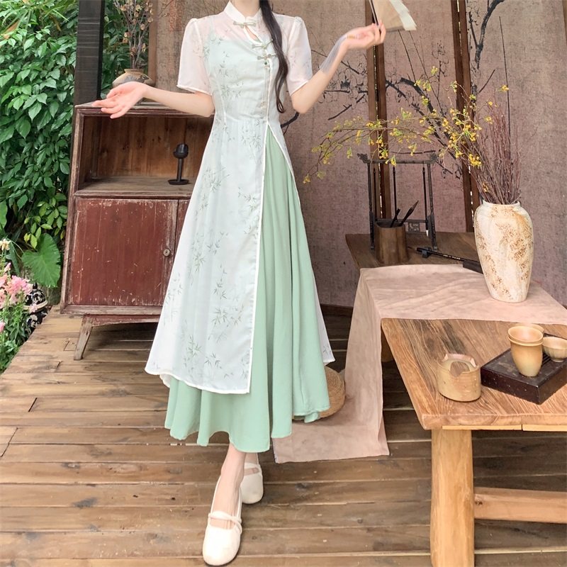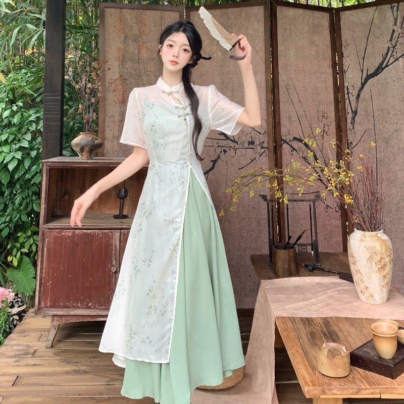 大码胖mm禅意新中式国风盘扣吊带连衣裙长衫女夏改良旗袍裙两件套