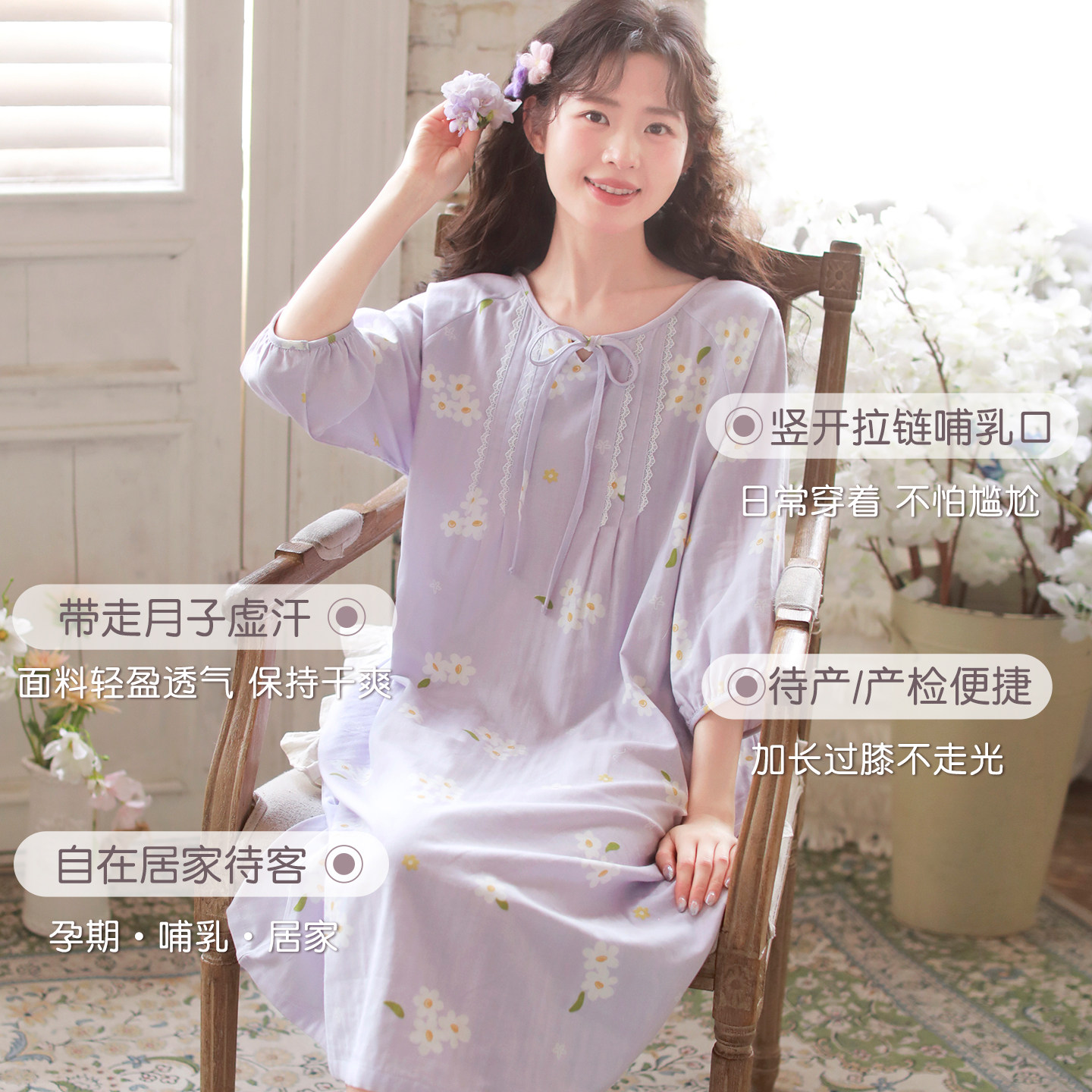 富朵夏季纯棉纱布孕妇睡裙医院待产裙产后哺乳月子睡裙产检家居裙