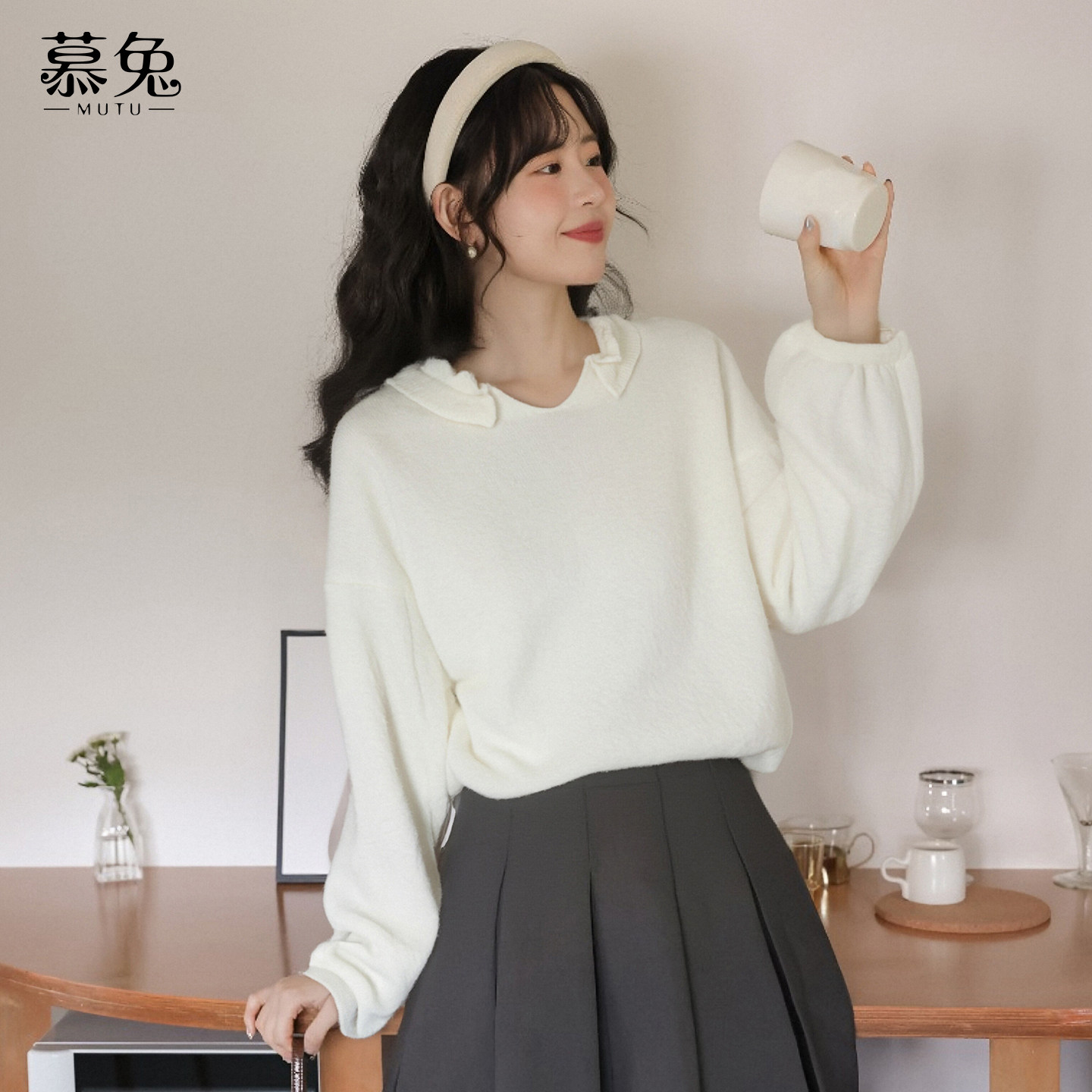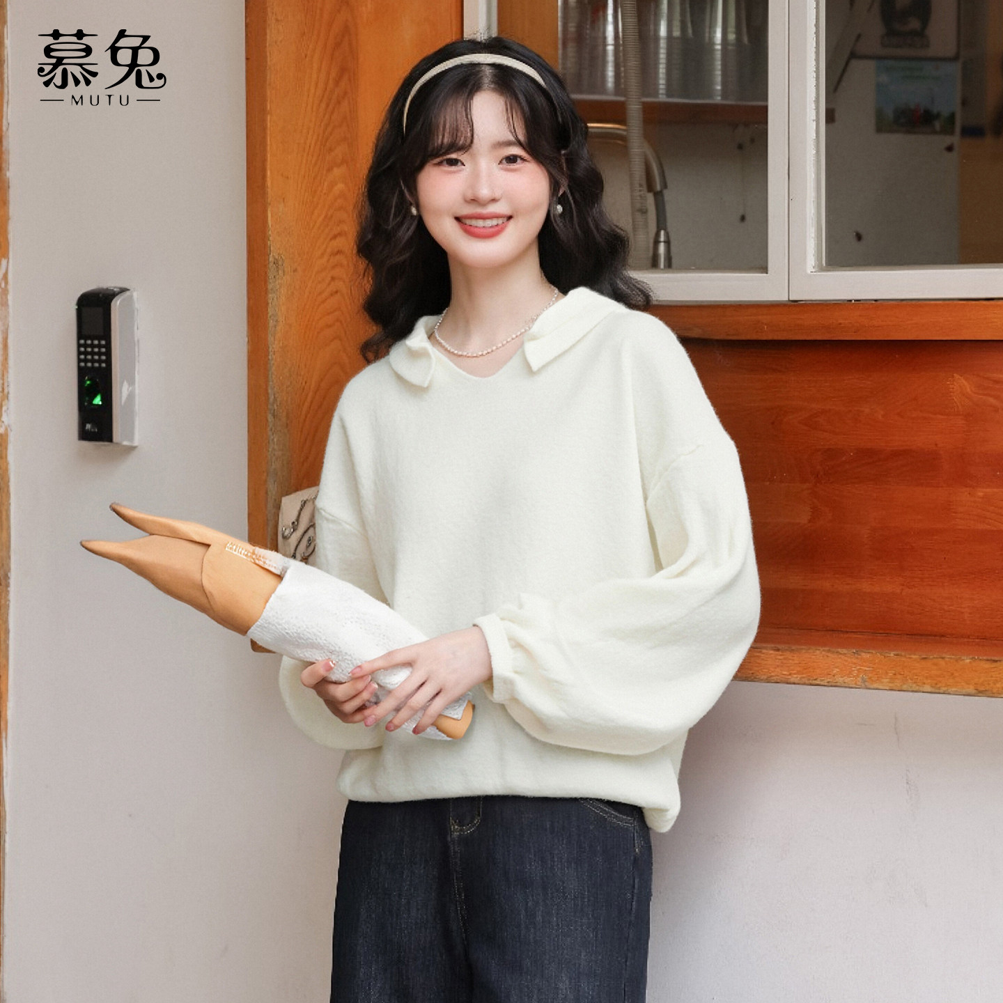 慕兔温柔风白色v领毛衣女2025冬季新款软糯宽松长袖套头针织上衣